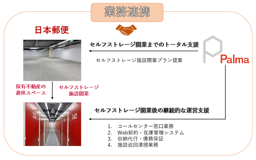 パルマは、業務連携先の日本郵便株式会社が試行する八幡西郵便局でのセルフストレージ事業について、オープンまでのトータル支援を行いました。