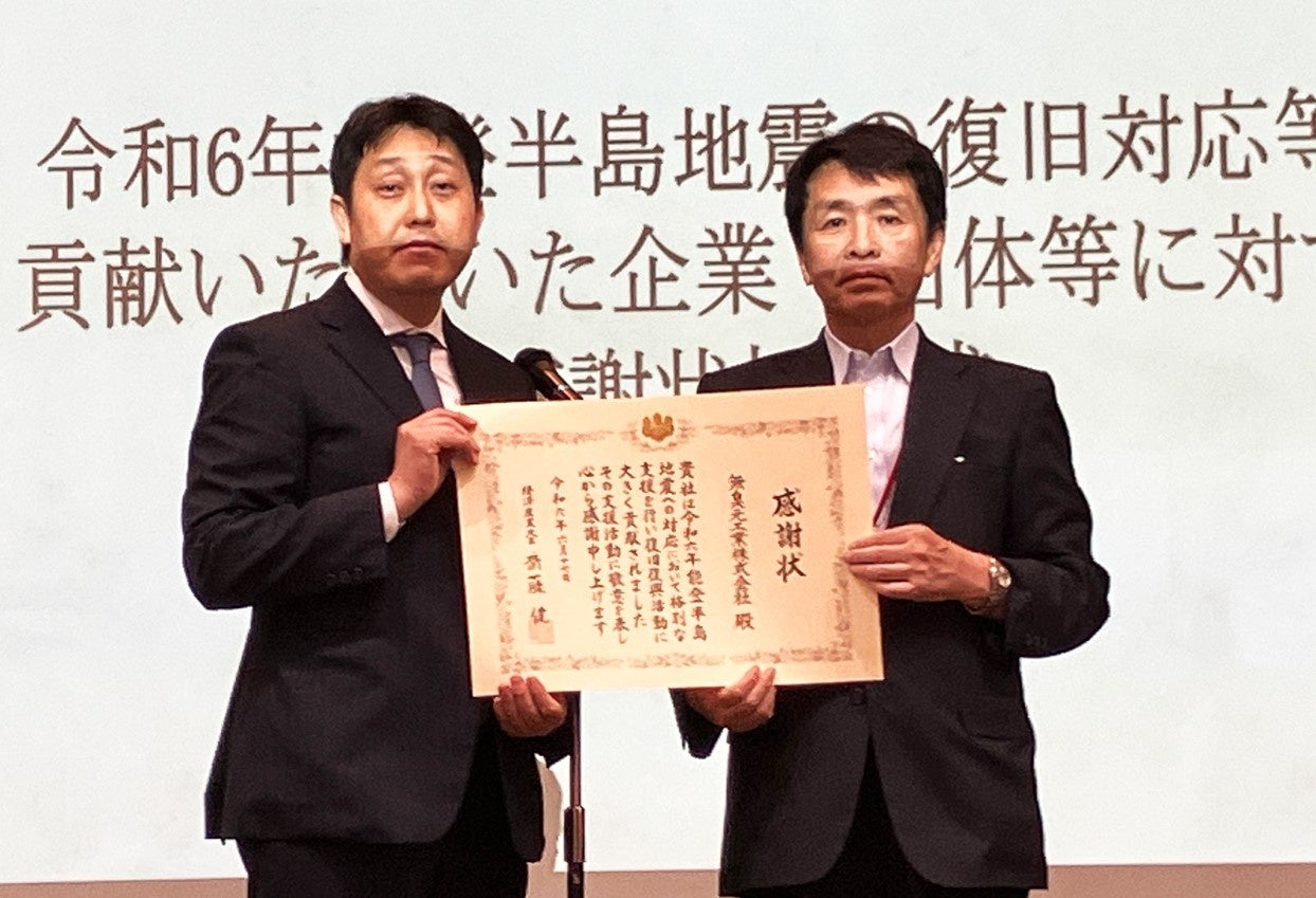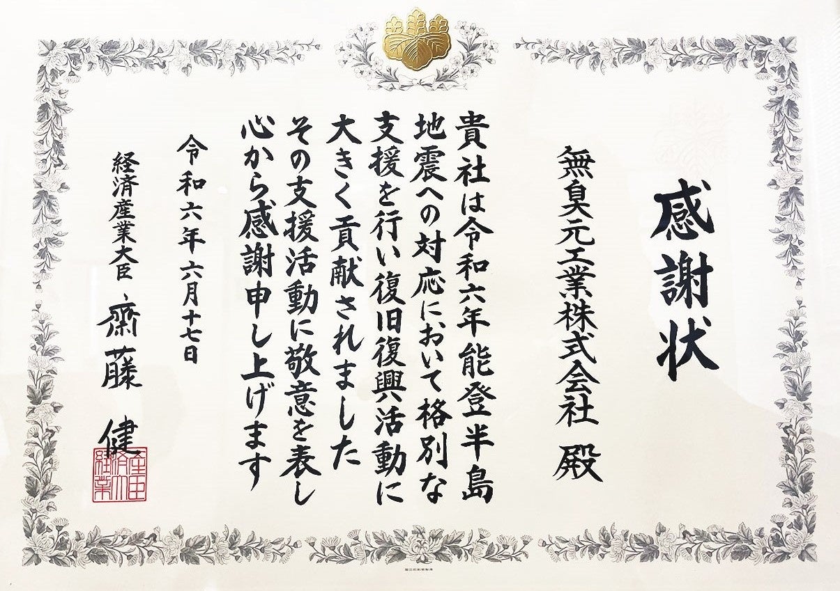 無臭元工業、令和6年能登半島地震における支援活動について経済産業大臣より感謝状を賜りました