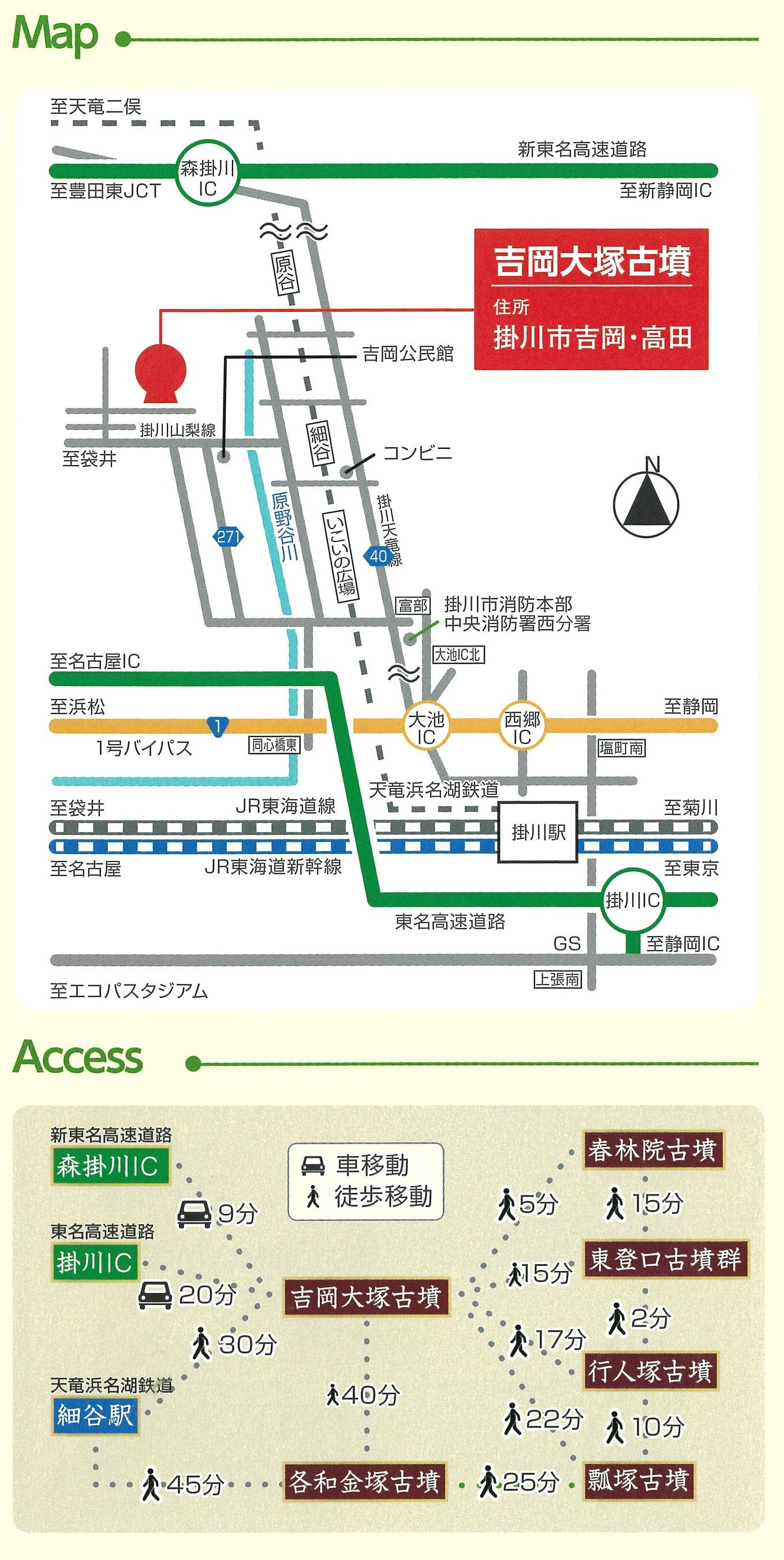 史跡和田岡古墳群は、古墳時代中期(約1600年から1500年前)に築かれた古墳群で、掛川市の北西部を流れる原野谷川が形成した河岸段丘上に位置しています。4基の前方後円墳と1基の円墳に埋葬された人々は、この地域を治めた首長の墓とされ、貴重な古墳群として平成8年に国の史跡に指定されました。