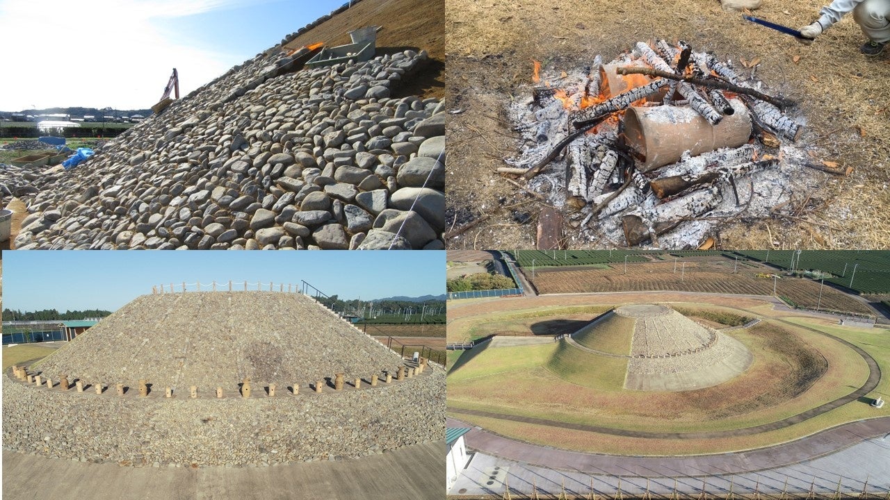 写真左上 葺石復元の様子 右上 円筒埴輪野焼きの様子