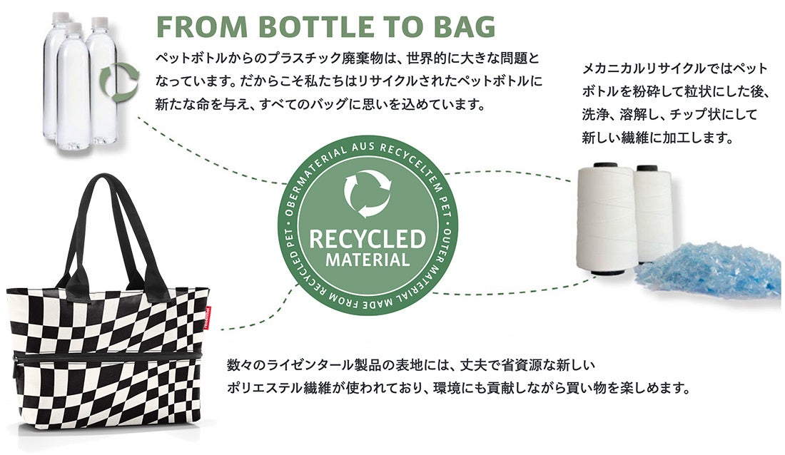今回の新柄「OP-ARTシリーズ」は、全モデルの表地にリサイクル素材を使用しています。廃棄されるペットボトルを粉砕、洗浄、溶解し、丈夫で省資源なポリエステル繊維としてバッグへと生まれ変わらせています。サステナビリティは、どんな時でもライゼンタールの使命のひとつとなっています。