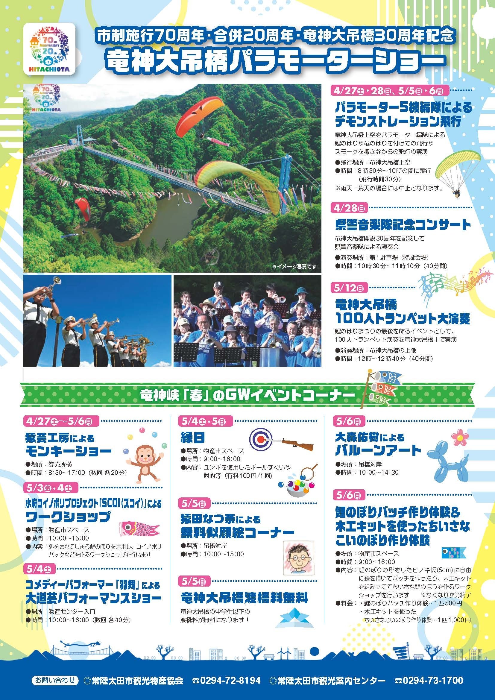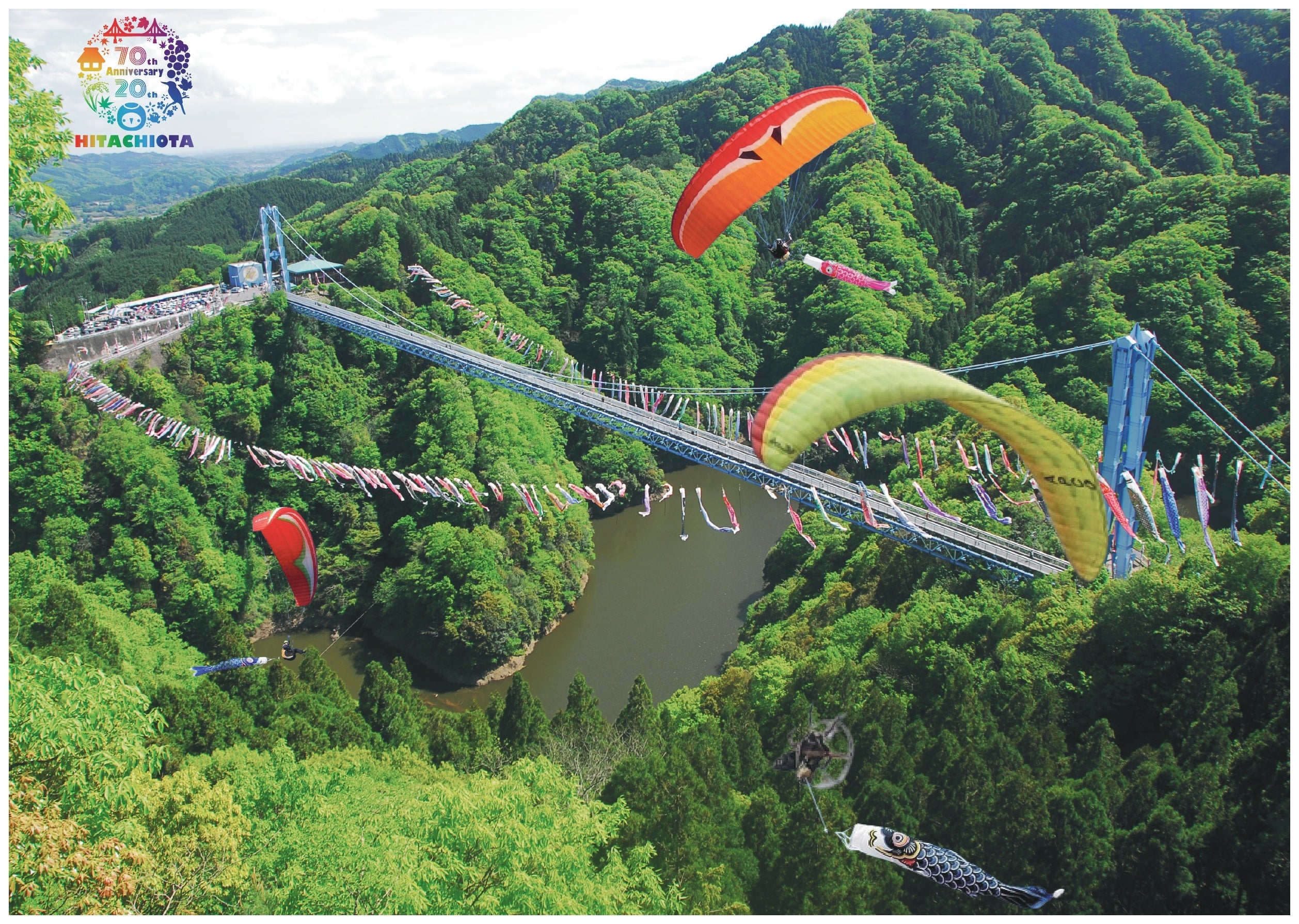 4月27日(土)から5月12日(日)まで開催。5月5日のこどもの日には、中学生以下の竜神大吊橋の渡橋料が無料!竜神大吊橋のライトアップやパラモーターショーなど見どころ満載!