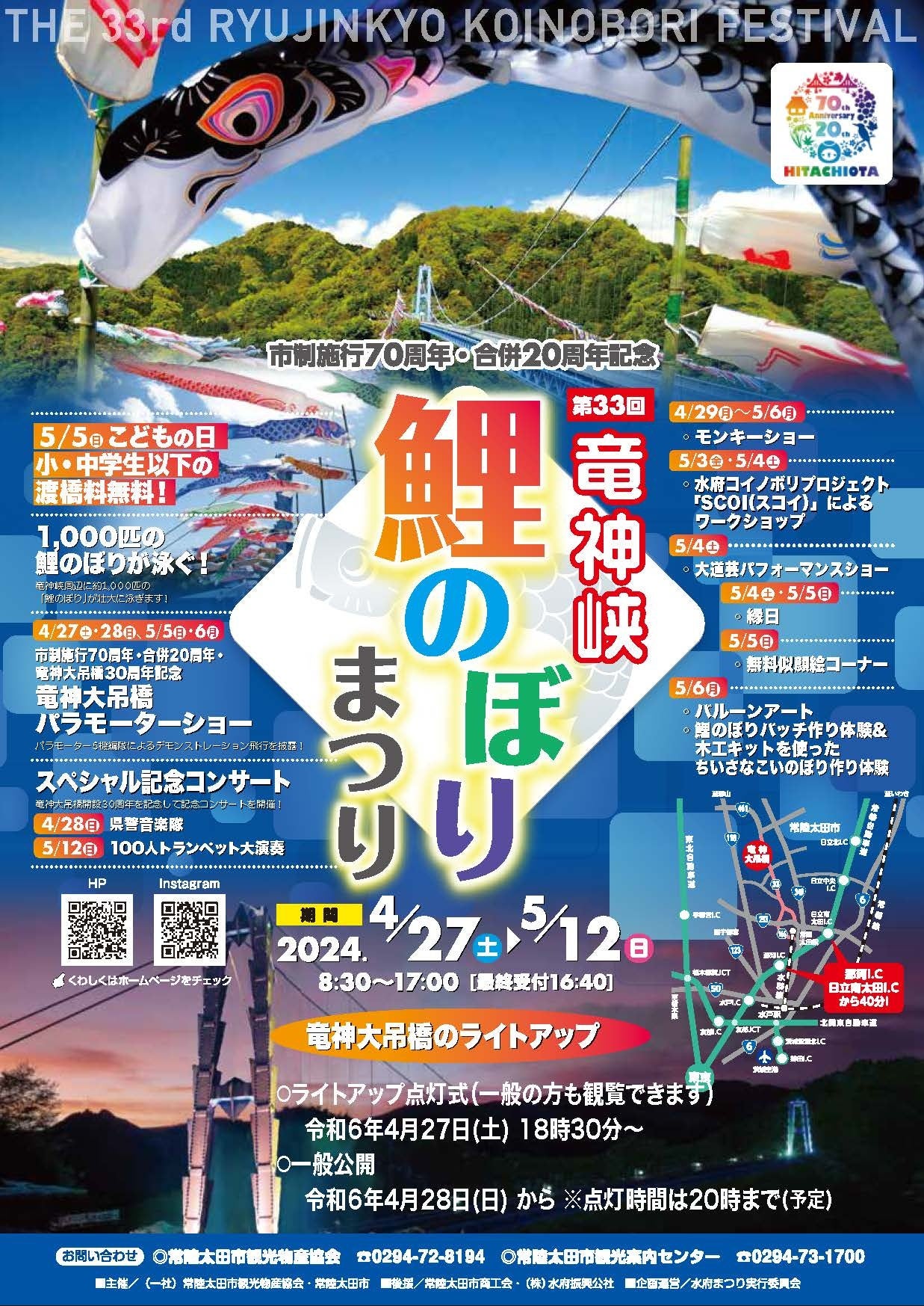 竜神峡鯉のぼりまつりでは、竜神ダム上空に約500匹、竜神大吊橋周辺や道の駅ひたちおおた沿道等に約500匹、合計1,000匹の鯉のぼりが群泳します。また、市内幼稚園、保育所、認定こども園等に通う園児が絵を描いたミニ鯉のぼりを、水府物産センター・竜神カフェ・市役所・図書館・道の駅ひたちおおた等に展示します。新緑の中を優雅に泳ぐ鯉のぼりは美しく大迫力です。