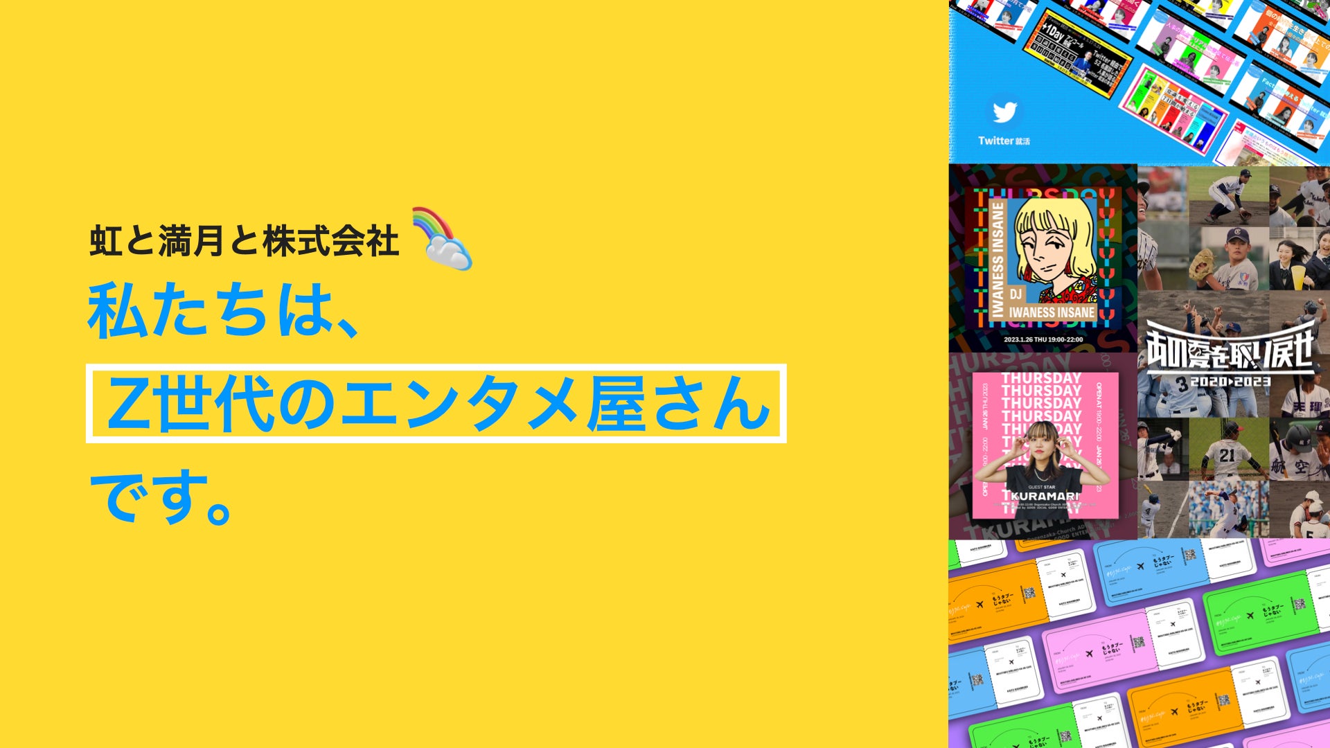 虹と満月と株式会社は、Z世代を代表するエンタメカンパニーです。 現代のSNSでの就活を切り開いた“Twitter就活”や、日本最大級のエシカルの祭典“エシカルエキスポ”など、既存の概念を変える企画で注目を集めています。大企業出身者やトップクリエイターの経験を活かし、PR設計、ブランディング戦略、マーケティング戦略、SNS運用をワンストップで提供。 「イケてるメンツたちとイケてるクリエイティブで地球を沸かせる」をビジョンに、企業や行政との共創も進めています。