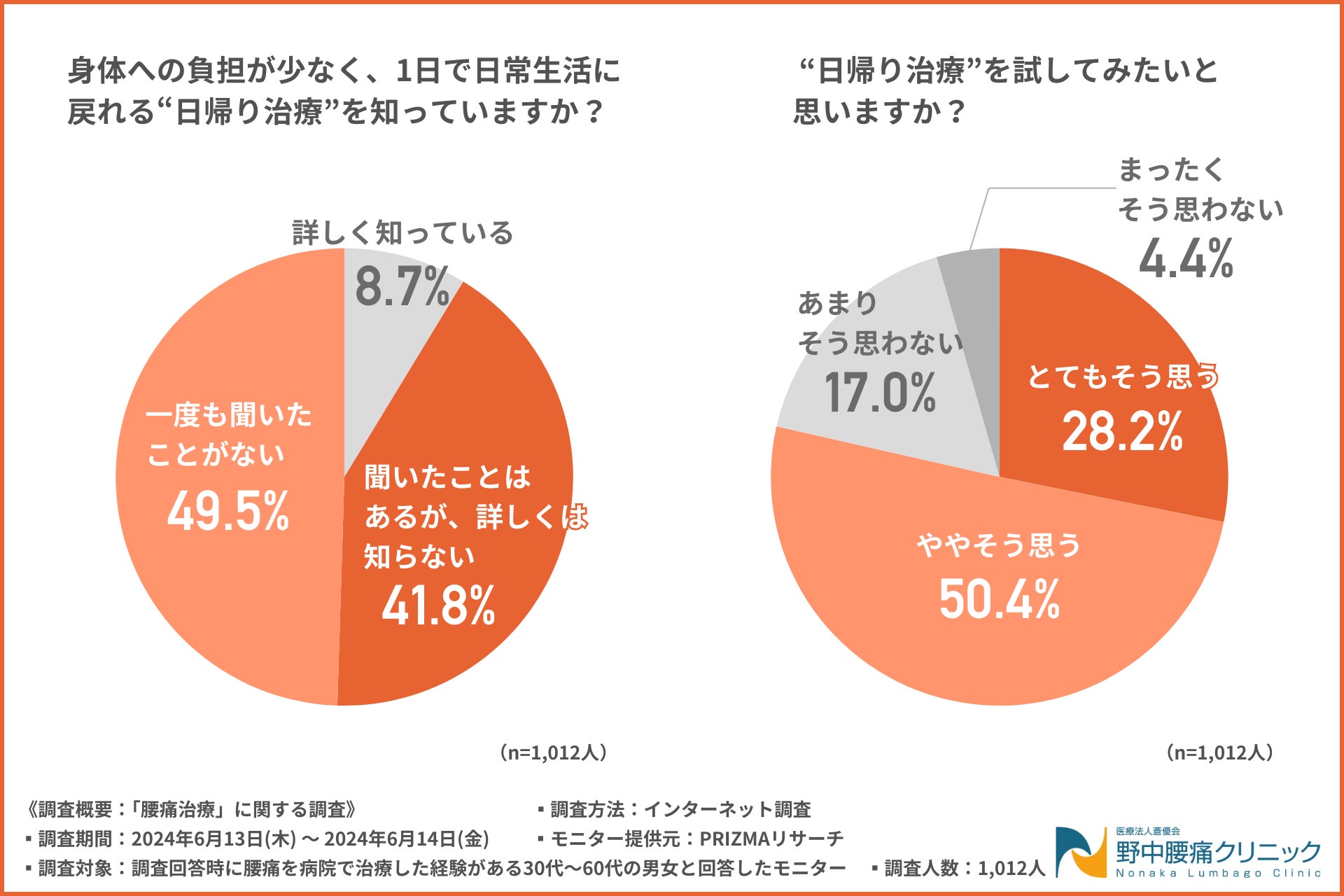 「聞いたことはあるが、詳しくは知らない」と「一度も聞いたことがない」を合わせると約9割になり、身体への負担が少なく、1日で日常生活に戻れる日帰りの腰痛治療はまだ広く知られていない現状が示されました。
