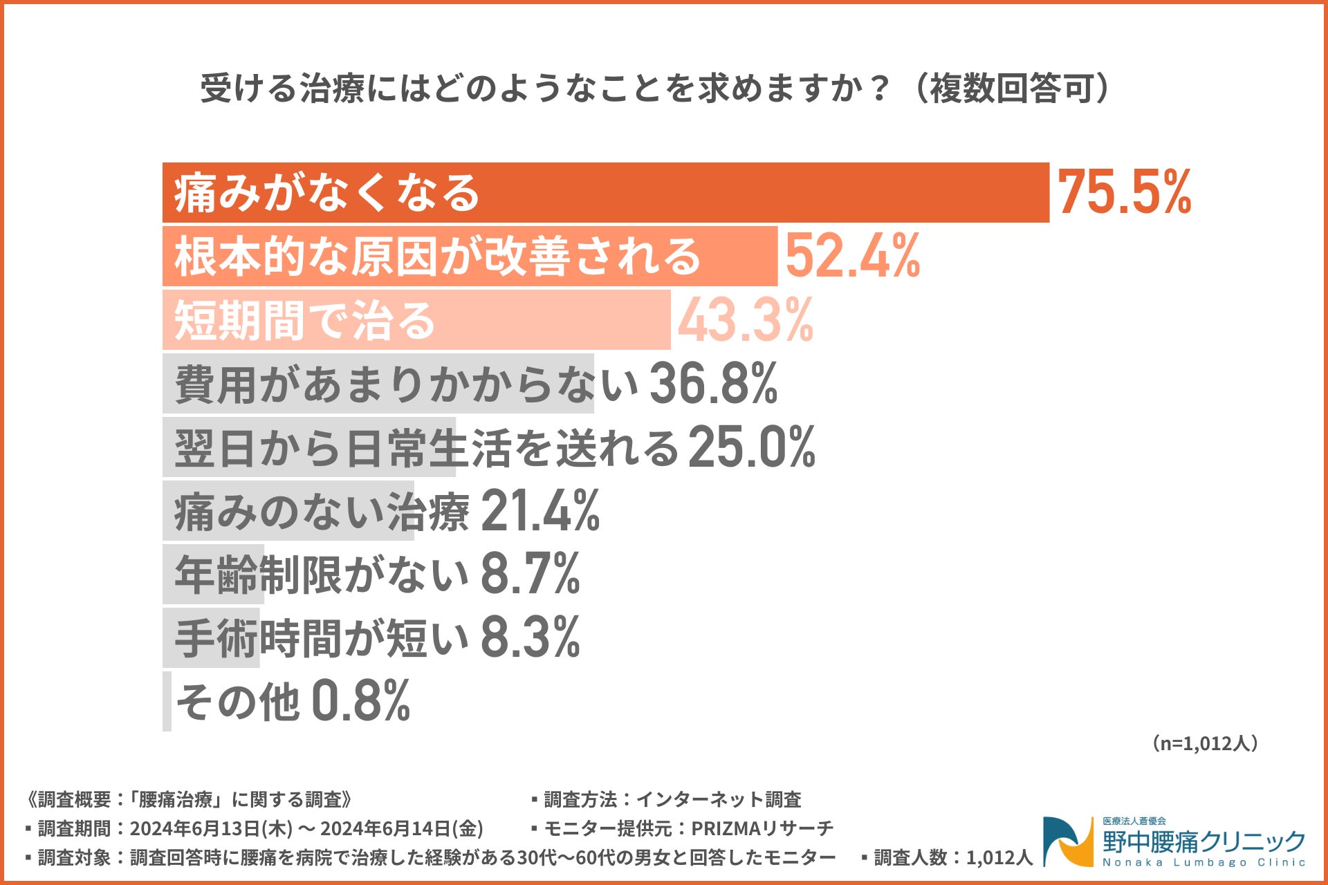 「受ける治療にはどのようなことを求めますか?(複数回答可)」と質問したところ、『痛みがなくなる(75.5%)』と回答した方が最も多く、次いで『根本的な原因が改善される(52.4%)』『短期間で治る(43.3%)』と続きました。