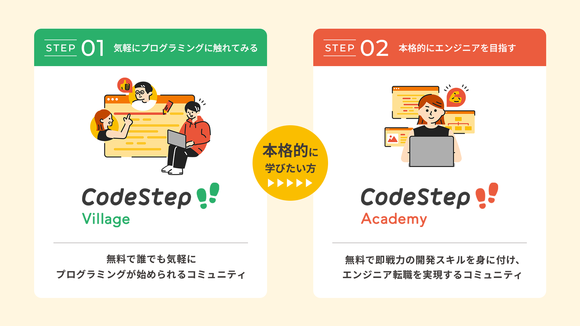 「CodeStep」 は無料で誰でも気軽にプログラミングが始められるコミュニティ「CodeStep Village」と無料で即戦力の開発スキルを身につけ、ITエンジニアへの転職を実現するアカデミー「CodeStep Academy」の2つのコースがあります。「CodeStep Village」では簡単なプログラミングに触れつつ、自身がプログラミングを楽しめるか、適性がありそうか等を試すことができます。その上で、もっと本格的にプログラミングに取り組みたい、IT