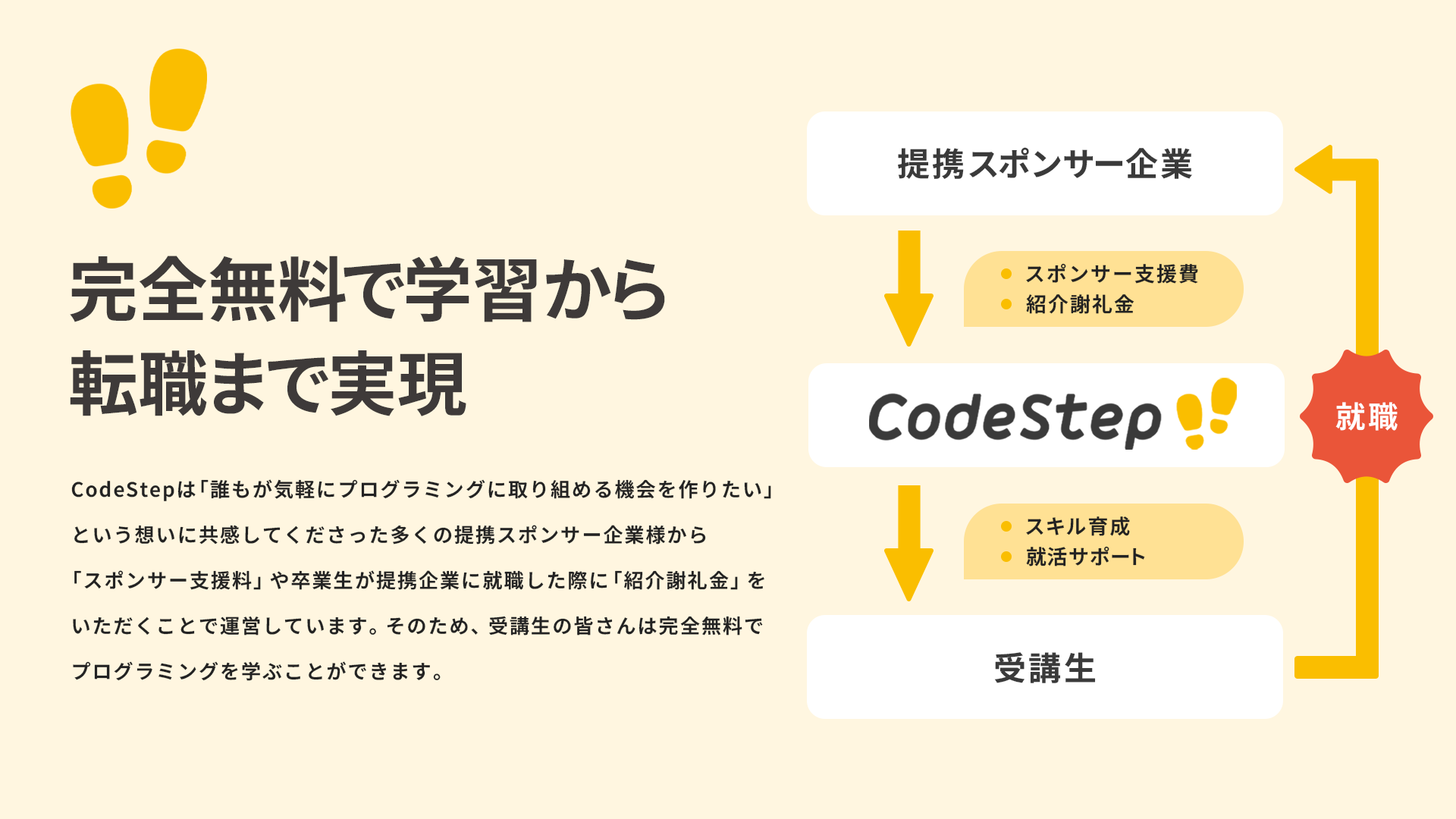スポンサー企業をはじめとする提携企業とエンジニア求人を随時連携しているため、CodeStep Academy修了時にすぐに転職先を検討することができます。今後企業の求人内容に合わせた個別の教育カリキュラム開発も予定しており、エンジニア転職が実現するところまでサポートいたします。