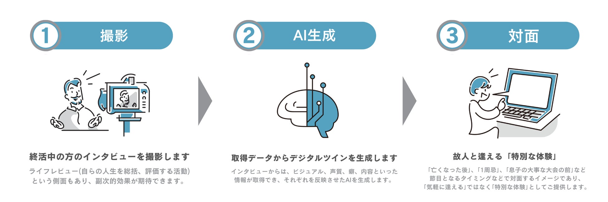 従来の終活(身の回りの整理、財産の相続、葬儀・墓の準備、遺言の執筆など)ではなく、弊社AI最新技術により「これまでの人生経験を語り継ぐ」「思考の伝承」を実現します。そして亡くなった後にもご家族やお世話になった方などが「対話できる」ような特別な体験を提供します。