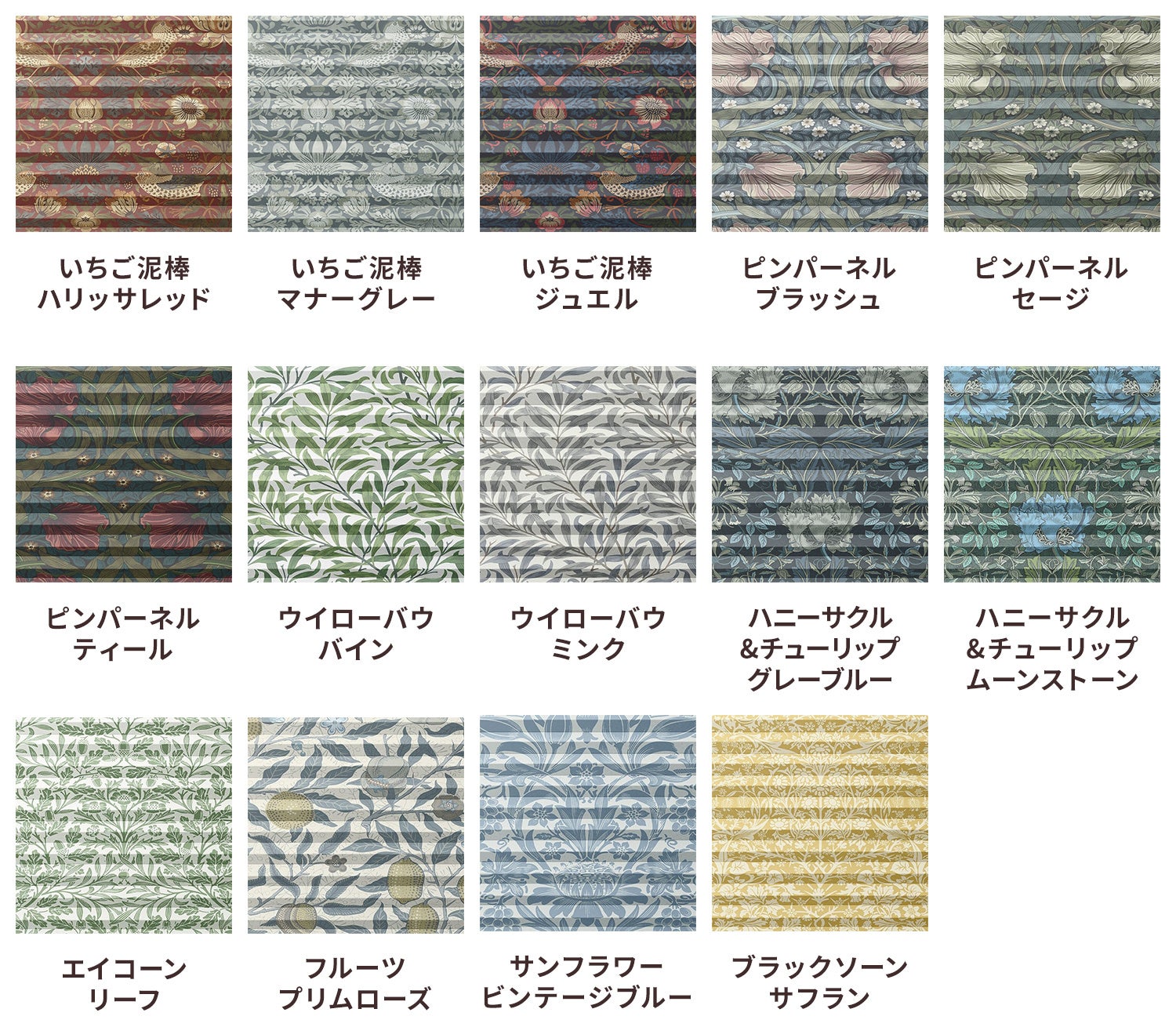 当社では遮光生地で20種類以上、採光生地で30種類以上の豊富なカラーバリエーションのハニカムシェードを展開しておりますが、このたびV&A に所蔵されているウィリアム・モリスのデザインからインスピレーションを得た「いちご泥棒」や「ウィローボウ」などの名作柄を中心に8つの柄・合計14のラインナップで遮光・採光生地のラインナップで新発売いたします。