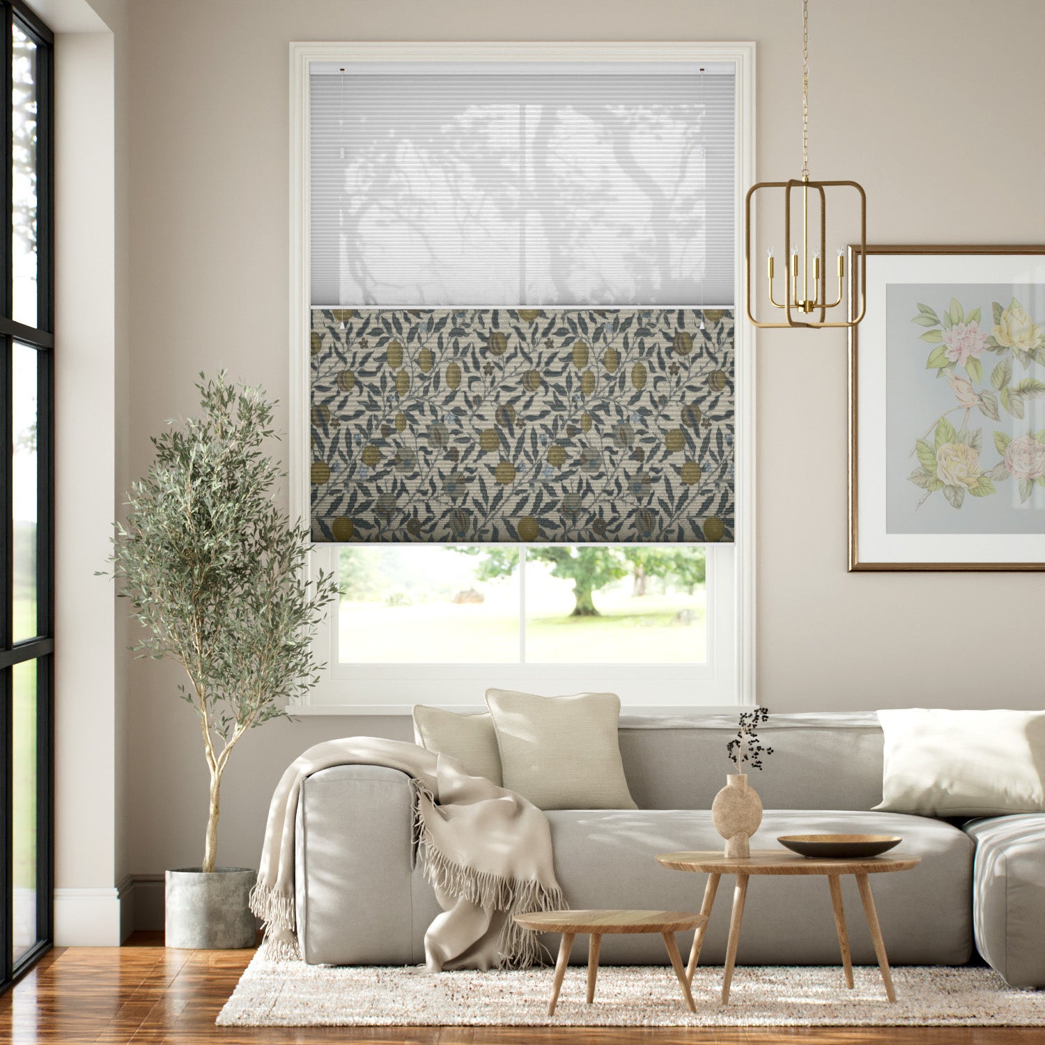 ※ツインハニカムシェード(採光/遮光)は採光生地がブライトホワイト、遮光生地がウィリアム・モリスデザインの生地となります。