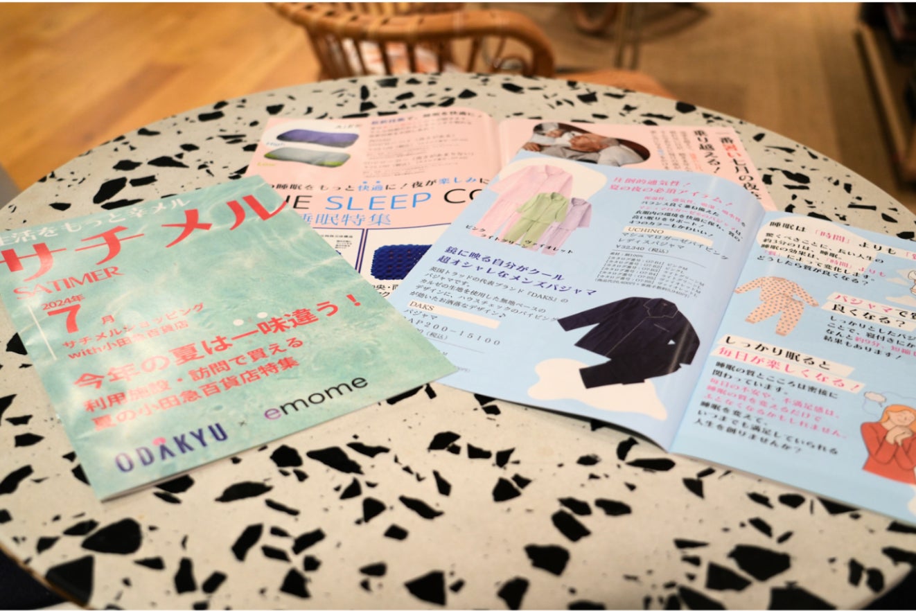 SATIMERは、小田急百貨店の商品を介護施設にいながら購入できるカタログ通販サービスです。小田急百貨店が厳選した商品を毎月雑誌形式でお届けし、希望する拠点では移動販売も行う予定です。年齢を重ねても幸せな日常を歩み続けて欲しいという思いを込めて「SATIMER」と名付けました。