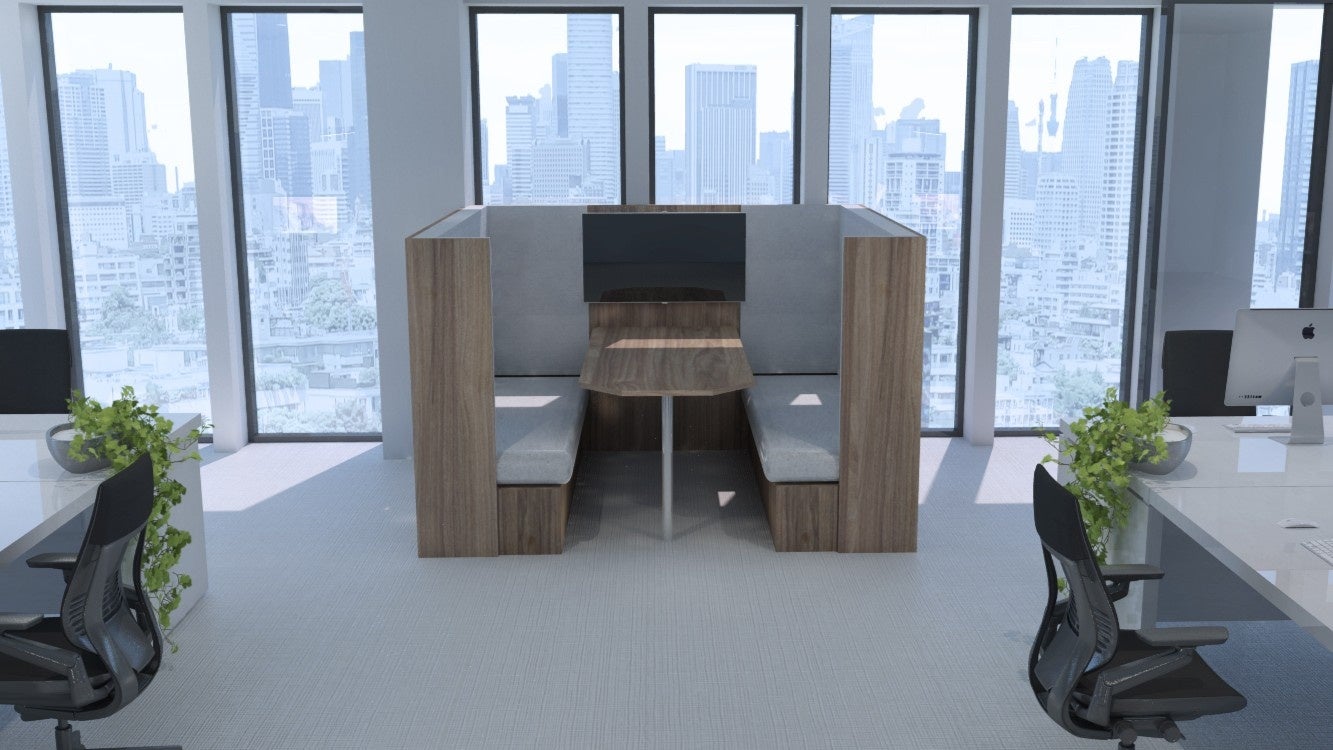 OPERAは6人がゆったり座れるソファとミーティングテーブルが一体になった空間家具です。対面式の3人掛けソファとパソコンを置くのに十分なゆとりのあるテーブルが、ジャストサイズの間仕切り壁で囲われており、お客様との商談や社員同士のミーティング、そしてオンライン会議にも最適な空間を提供いたします。