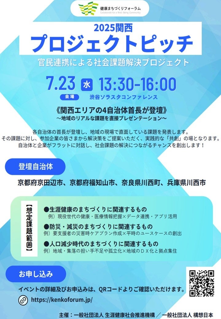(一社)生涯健康社会推進機構が運営する健康まちづくりフォーラムにて自治体プロジェクトピッチを開催します。課題解決に向け連携・協働できる企業様からソリューションを提案いただき、連携事業創出を目指します。