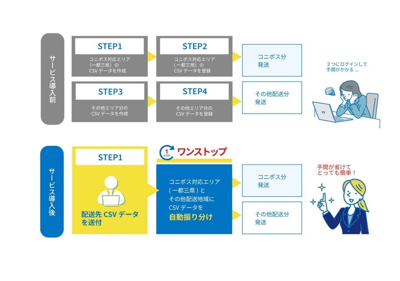 株式会社地区宅便(本社: 東京都練馬区、代表取締役: 河合秀治)は、ポストイン配送サービス「コニポス」にて、コニポスとゆうパケットのラベル発行が簡単にできる新ラベル発行システムを導入しました。従来、コニポスを利用するお客様がコニポス対象エリア外に発送する際はゆうパケットをご利用いただくことが可能でしたが、ラベル印刷時にシステムの切り替え作業が必要でした。この度の新システム導入によって、システムの切り替え作業がなくなるため、お客様の利便性が向上します。