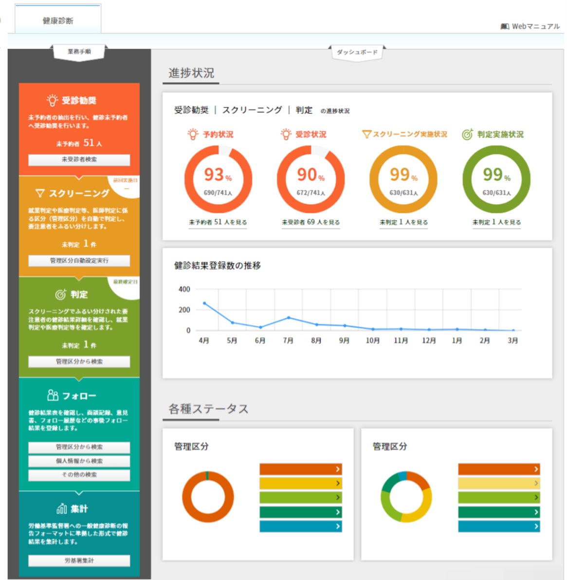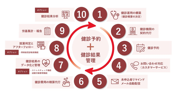健診予約・健診結果管理を支援するクラウド型の健康管理サービスです。健康診断周りの業務をワンストップでサポートし、従業員への健康経営の促進と、人事・労務・健康管理担当者の業務量削減に寄与します。