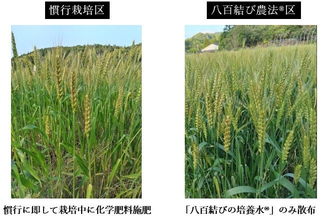 小麦圃場(鹿児島県)において、同日に同一株間での定植をして「八百結びの培養水®」の使用可否による比較栽培をした結果、「八百結びの培養水®」を使用した小麦の方が、株分けも多く、葉がイキイキと生育し、色つやも良く、生長期間が長くなりました。小麦は枯れてから収穫となりますが、枯れ始めるまでに10日間程度の差が出ました。この目に見える差は、①健康効果の向上と ②抗酸化作用によるものと考えられます。また、目視はできないものの作物内では、③細胞の修復と再生、および ④免疫調整作用、が得られていた可能性が推察されます。