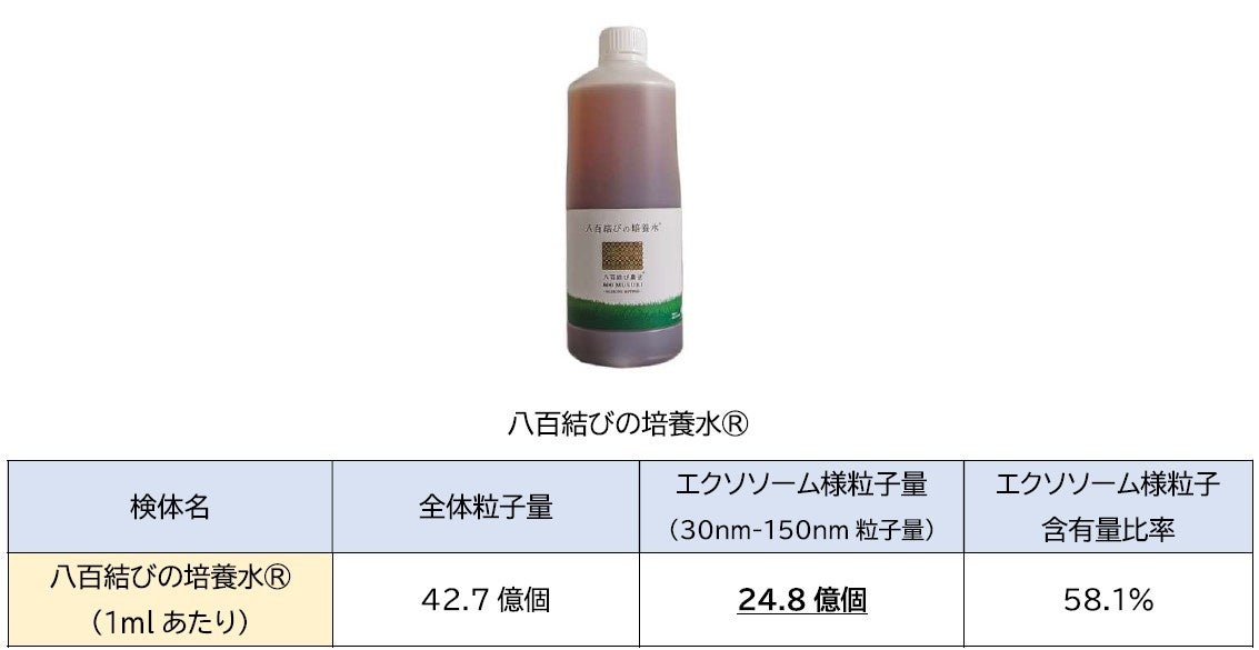 土着微生物の活性によって土を発酵させる新しい土づくりを実践する 壌結合同会社(よみ:つちむすび、所在地:東京都千代田区、代表社員:金瀬伸吾)は、テクノロジーと栄養学を融合させた国産野菜パワーを提供するベジタブルテック株式会社(本社:広島市西区、代表取締役:岩崎 真宏)、および修復医療エクソソームとテロメア研究に基づく「細胞活性メソッド」で健康長寿社会を創造するExoEarth株式会社(よみ:エクソアース、本社:東京都港区、代表取締役:西平 隆)と取り組む、『医食土同源』をテーマに“食べるエクソソーム”分野の開発に向けた共創プロジェクト「EXO-Vegeプロジェクト」において、「八百結びの培養水®(よみ:やおむすびのばいようすい)」より、24.8億個(1mlあたり)の豊富なエクソソーム様粒子が検出された(*1)ことをお知らせいたします。