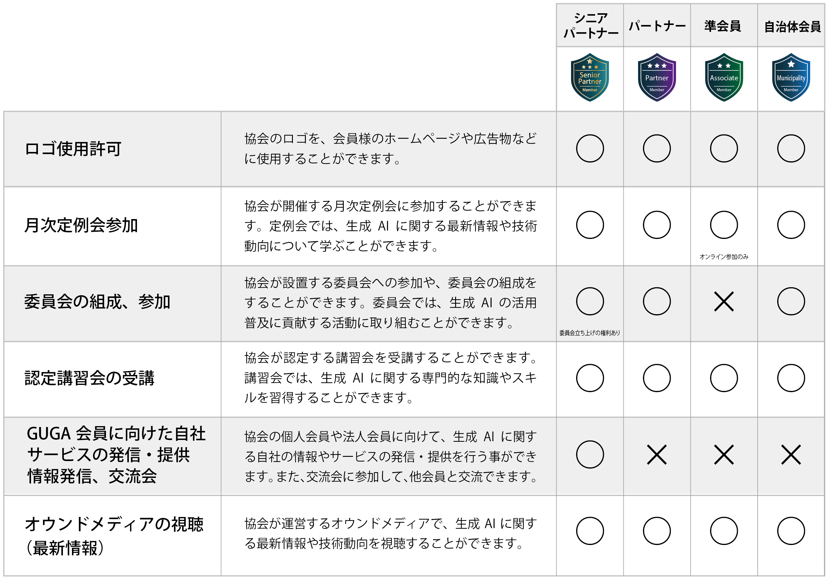 そのほかにも、生成AIに関する知識・スキルを習得することができる「認定講習会の受講」や生成AIの社会実装に向けた活動を会員の皆さまとともに実施する「委員会の組成・参加」といった特典をご用意いたしております。また、シニアパートナー会員においては、「GUGA会員に向けた自社サービスの情報発信」も可能です。これらのサービス提供を通じて、生成AIコミュニティを形成し、取引の活性化やマッチング支援を推進して参ります。
