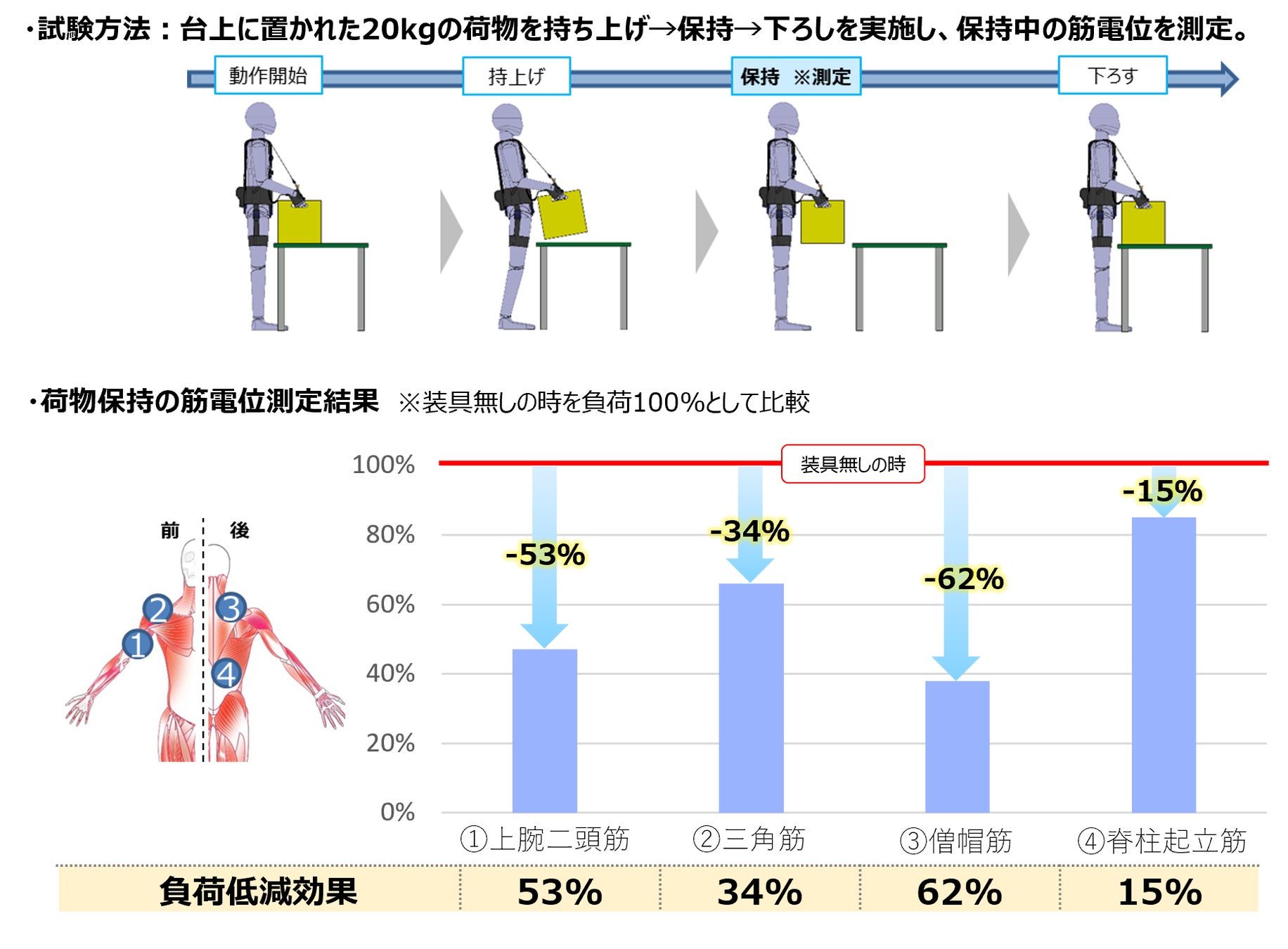 測定結果として上腕二頭筋及び僧帽筋の負荷が50%以上低減する等、複数箇所での負荷低減効果を確認しました。