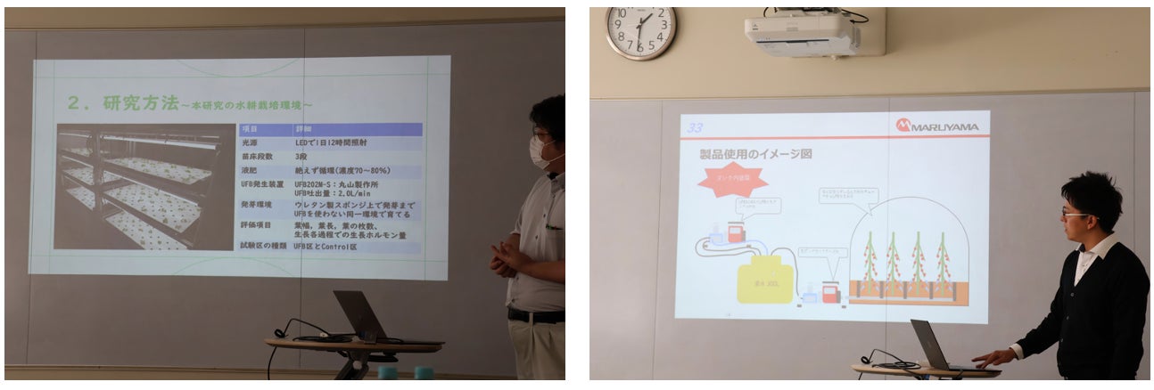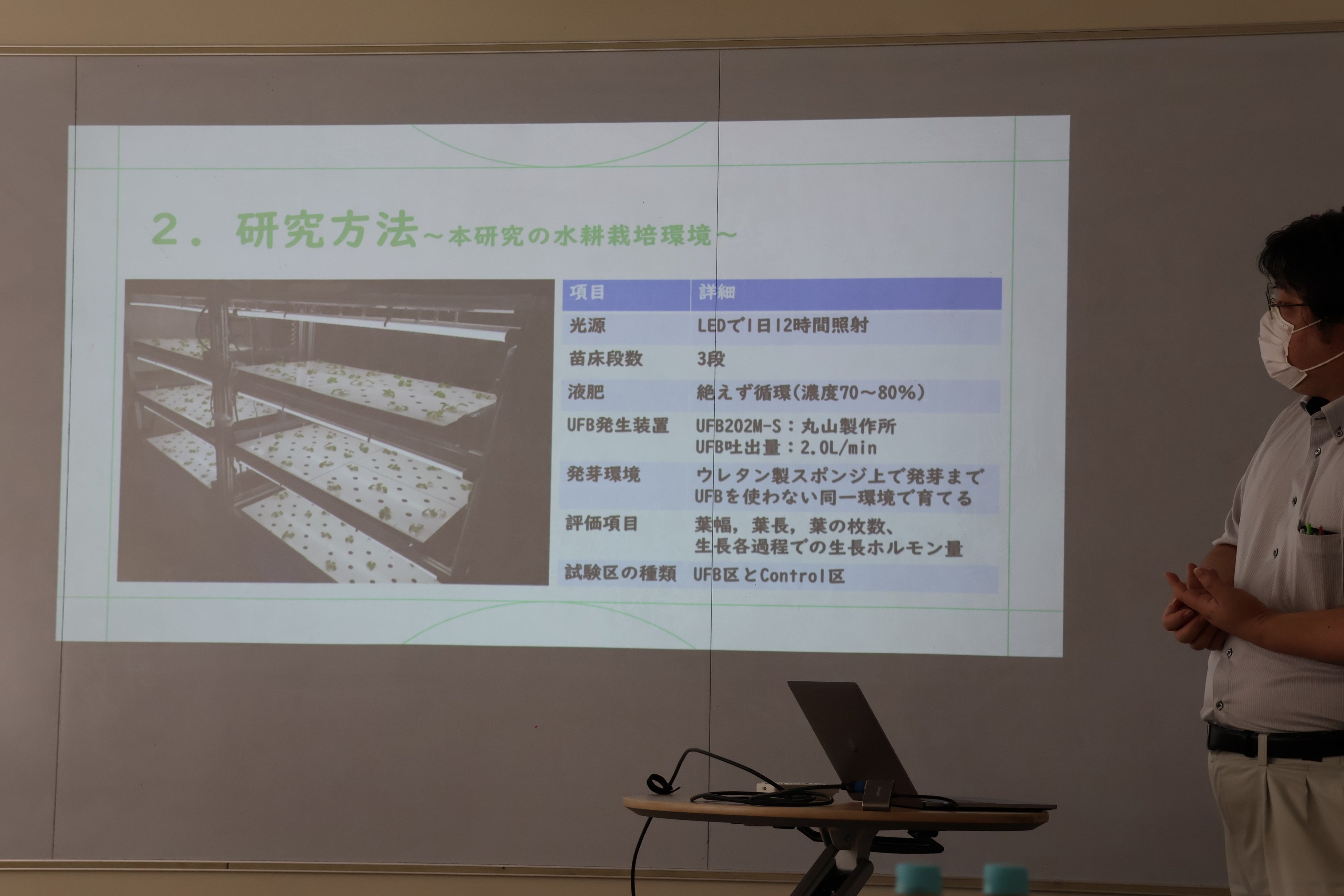 丸山製作所は、水耕栽培などの現場におけるMUFBウルトラポンプの導入など、農業分野等への技術・製品の提供を行ってきました。実際の農産業の現場でウルトラファインバブルの活用が大きな成長促進効果をもたらす場合がある一方で、効果があまり見られない事例も存在していました。その要因の一つとして外的なものが考えられるため、同一の栽培環境を構築し、ウルトラファインバブルが植物の成長に与える影響を、ファインバブルの研究を長年続けている高知工業高等専門学校とともに調査するに至りました。