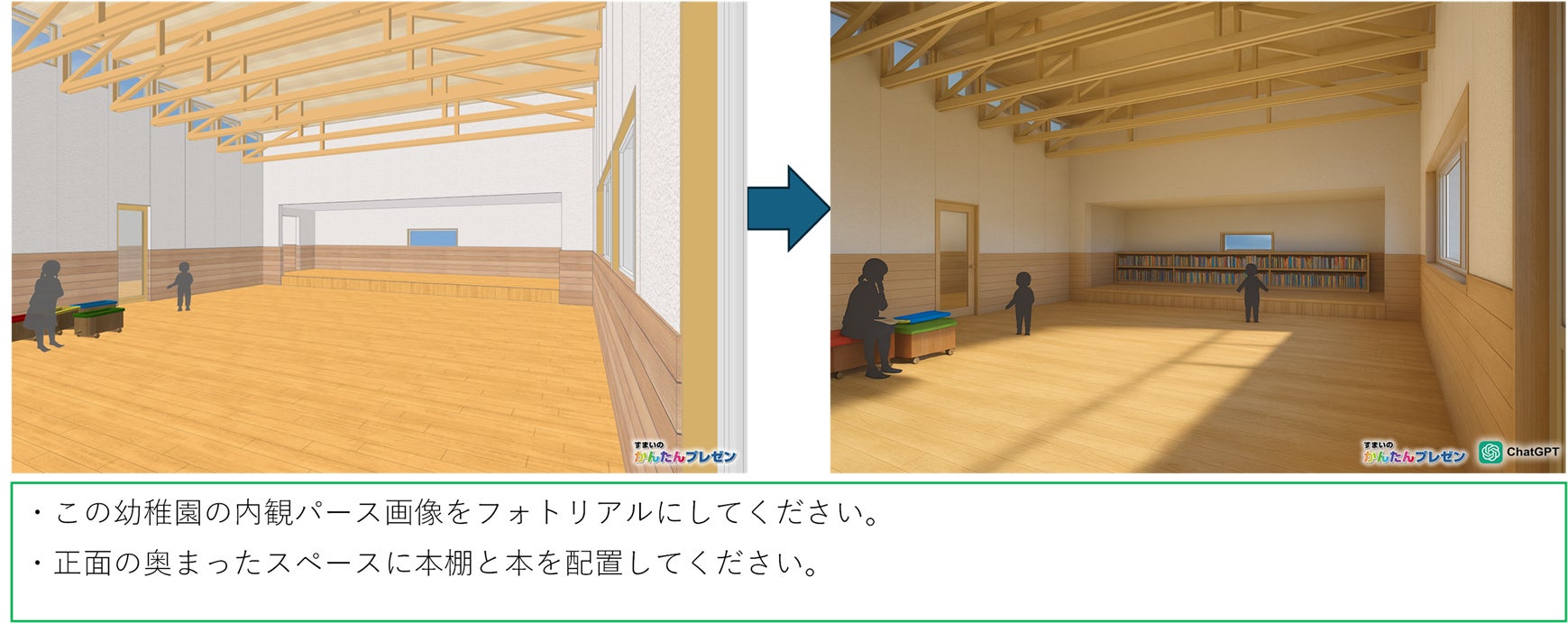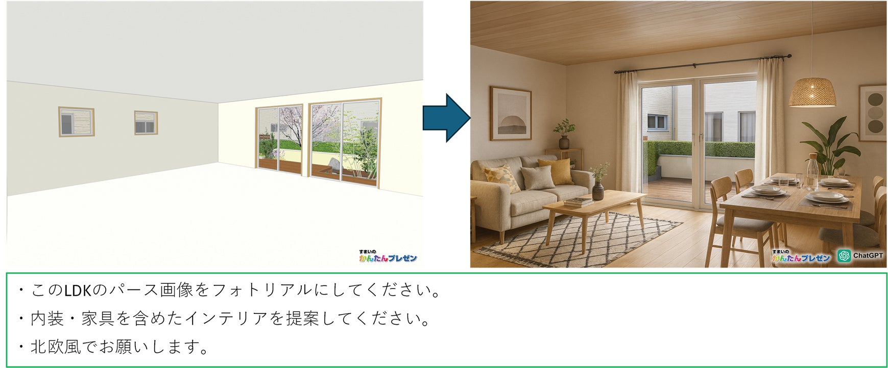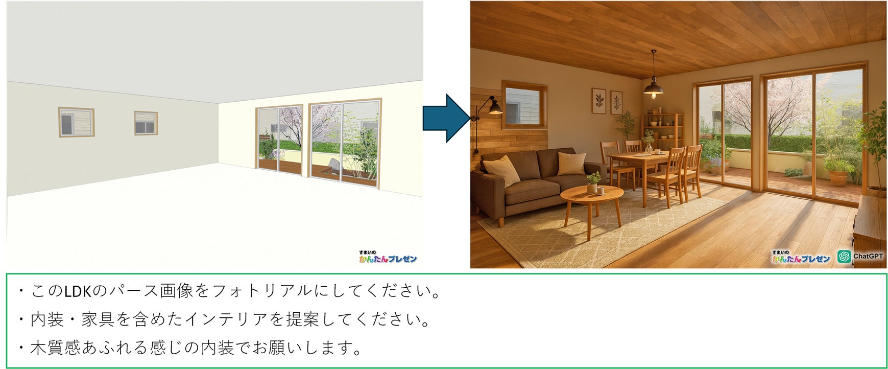 右は、すまいのかんたんプレゼン作成のパースをもとに、ChatGPT 5にプロンプトを与えて作成した画像です。(緑の枠内が、実際に使用したプロンプトです。)