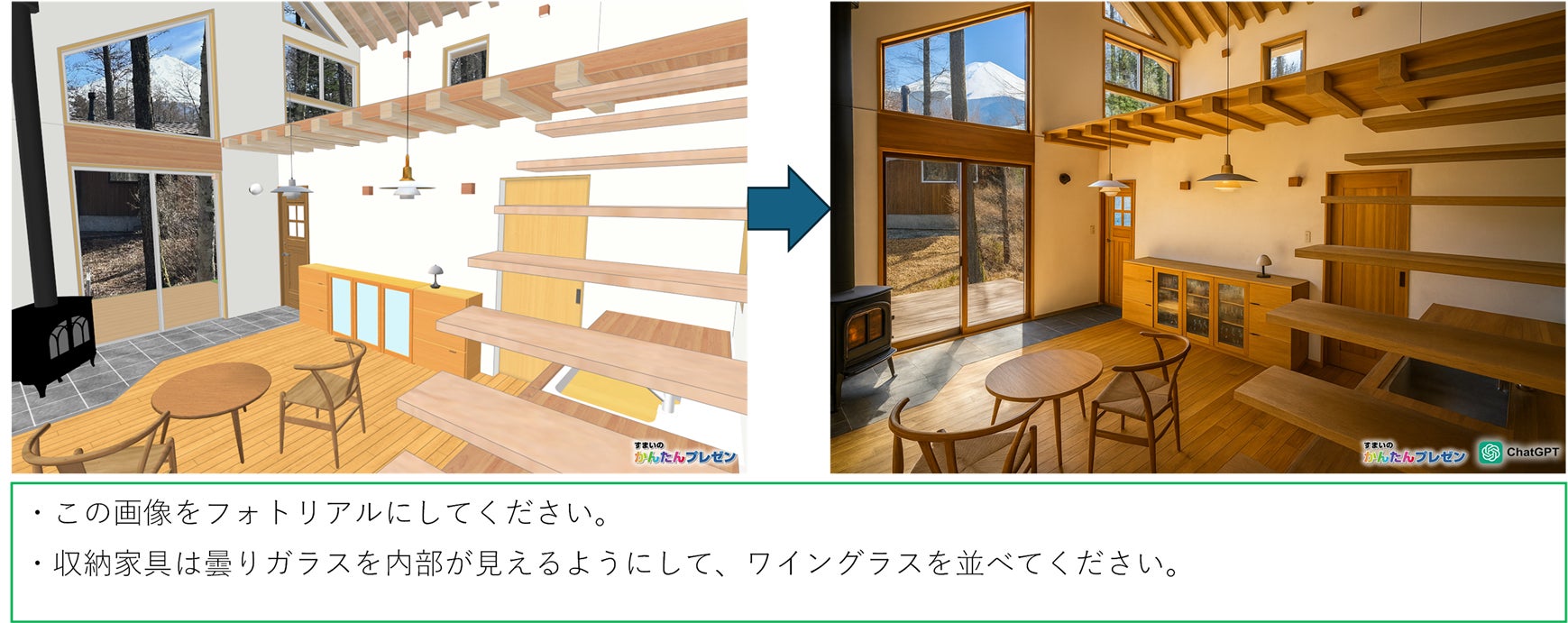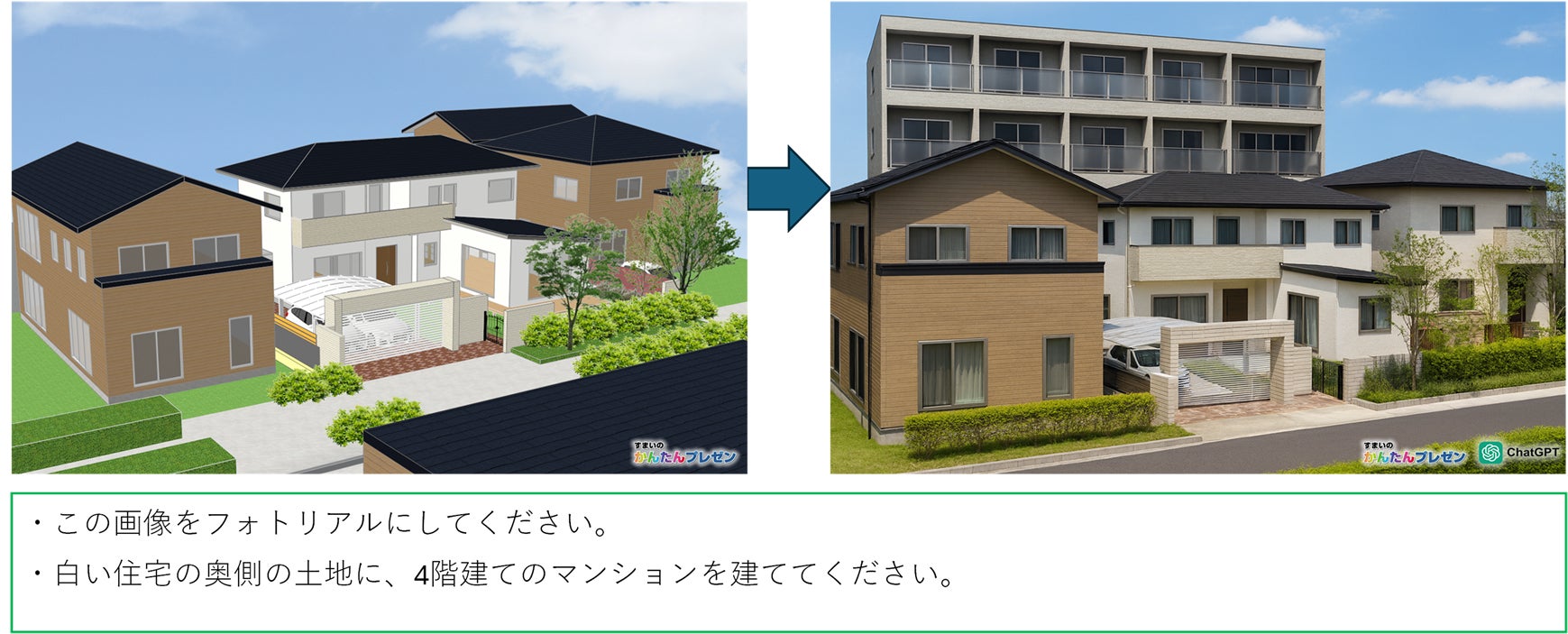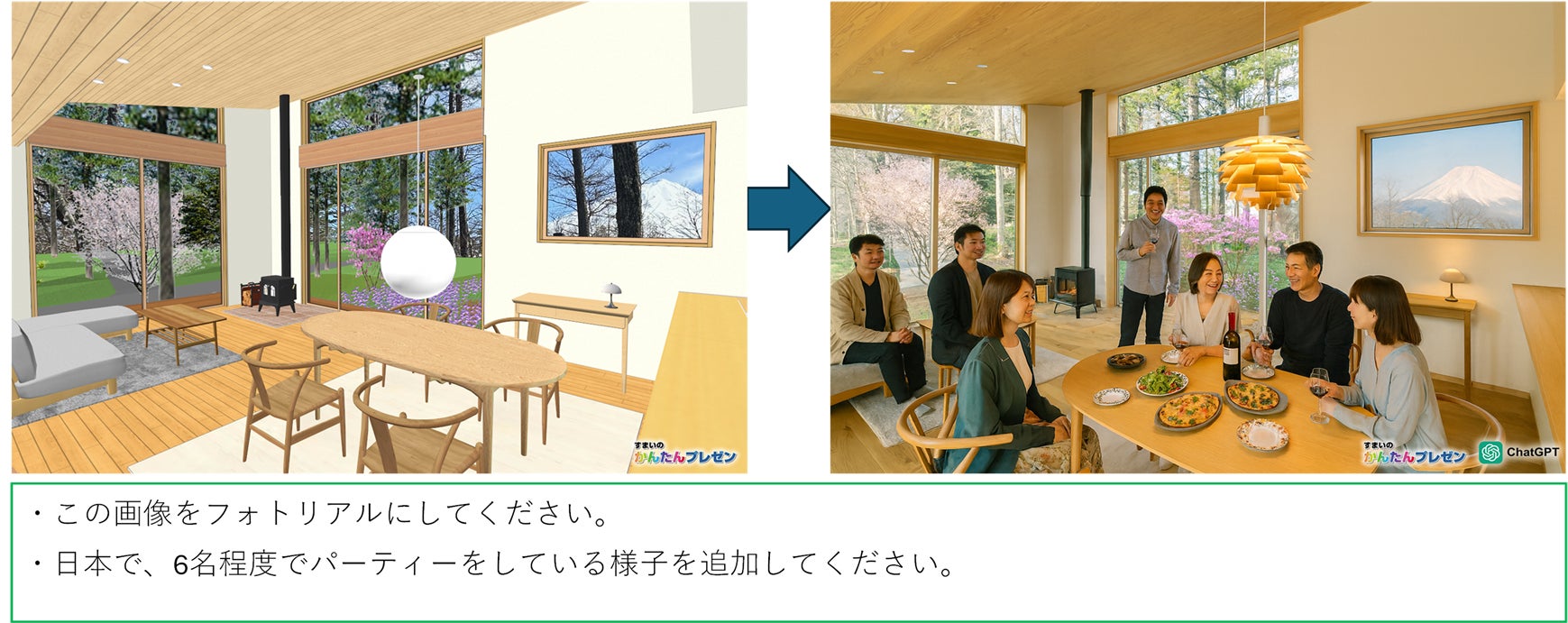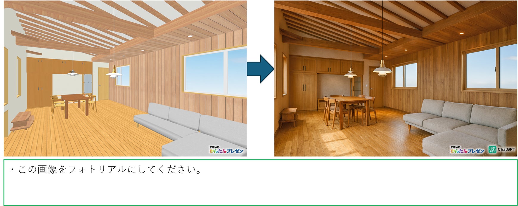 なお、本機能を利用するには、ユーザー自身において、画像生成AIサービス(ChatGPT、Geminiなど)の利用契約が必要です。しかしながら、たとえばChatGPTの個人向け有料プランである「ChatGPT Plus」を利用した場合、月額の利用料金は約3,000円(20 USD)。「すまいのかんたんプレゼン」本体価格の66,000円とあわせても、非常に安価にフォトリアルな建築パースが実現することになります。