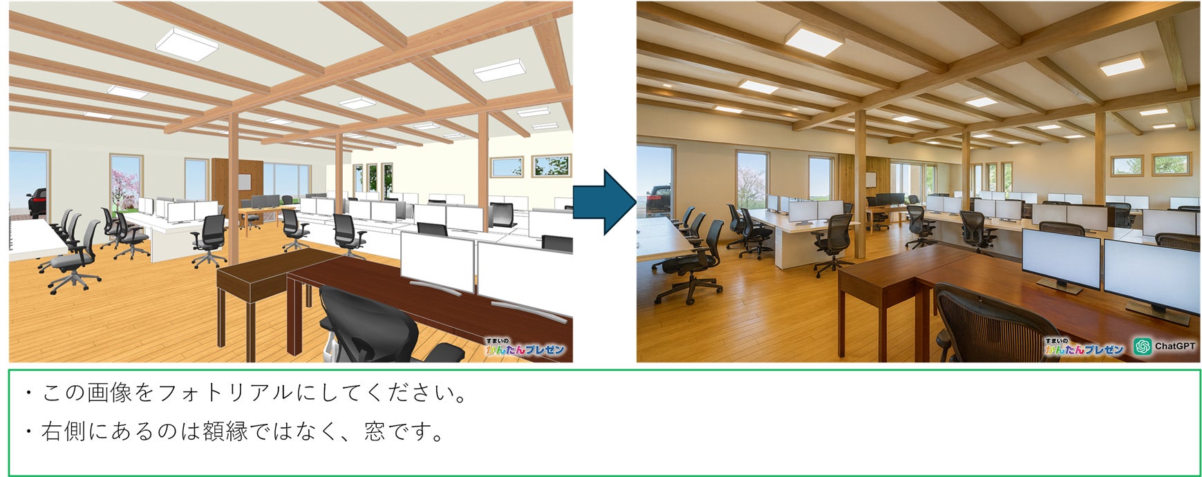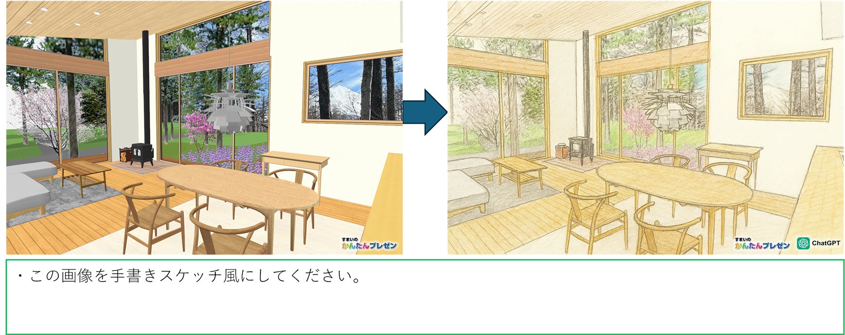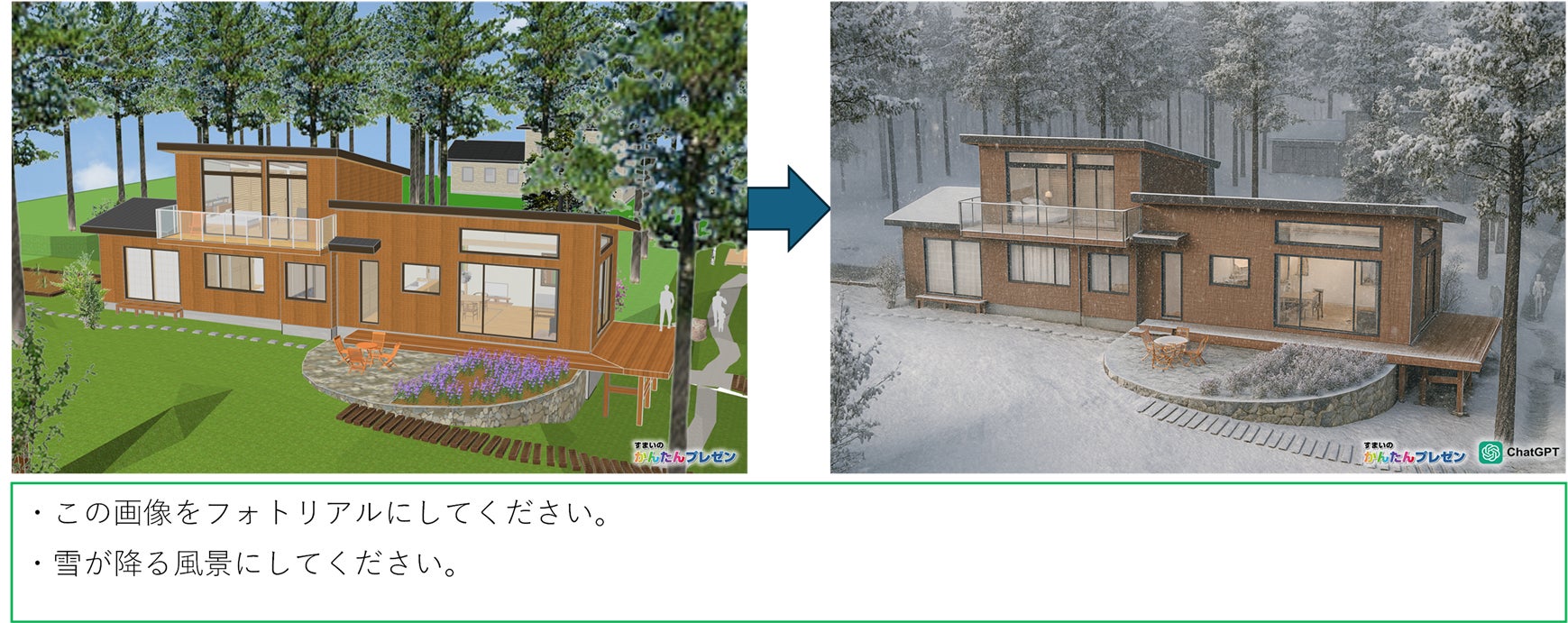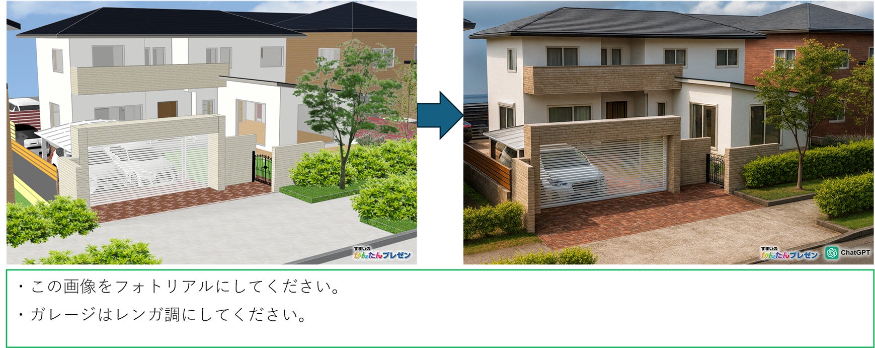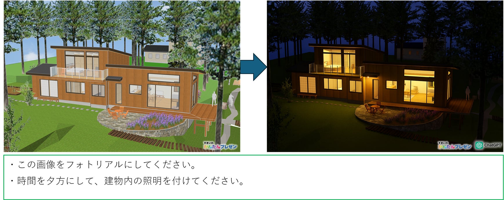 なお、本機能を利用するには、ユーザー自身において、画像生成AIサービス(ChatGPT、Geminiなど)の利用契約が必要です。しかしながら、たとえばChatGPTの個人向け有料プランである「ChatGPT Plus」を利用した場合、月額の利用料金は約3,000円(20 USD)。「すまいのかんたんプレゼン」本体価格の66,000円とあわせても、非常に安価にフォトリアルな建築パースが実現することになります。
