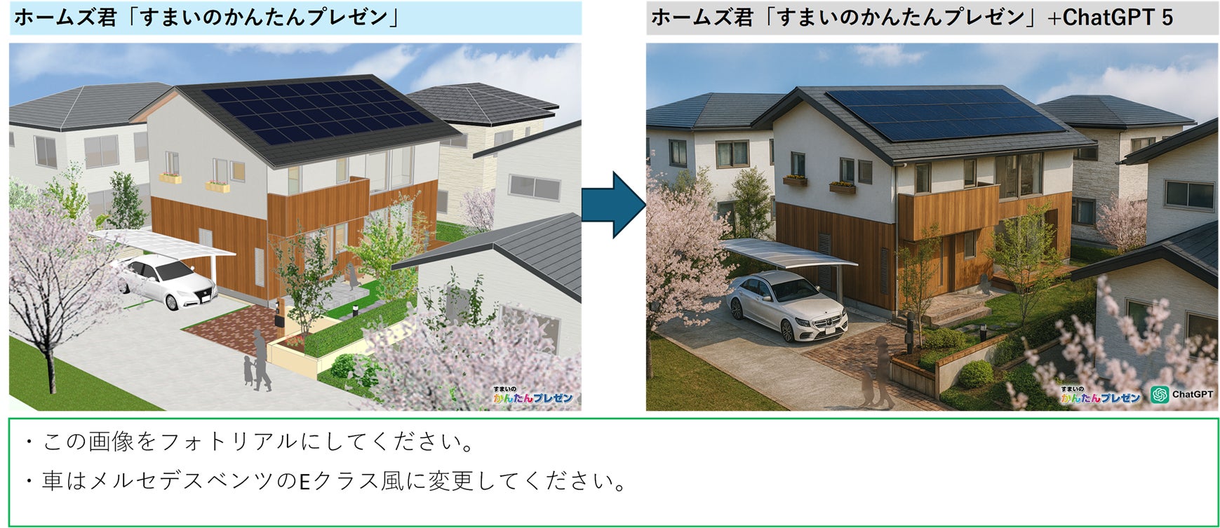 (↑ホームズ君「すまいのかんたんプレゼン」で作成した3Dパースをもとに、画像生成AIで作成した高品質パースの例。2025年10月末リリース予定の新機能を使えば、こうした高品質パースが安価に実現。)
