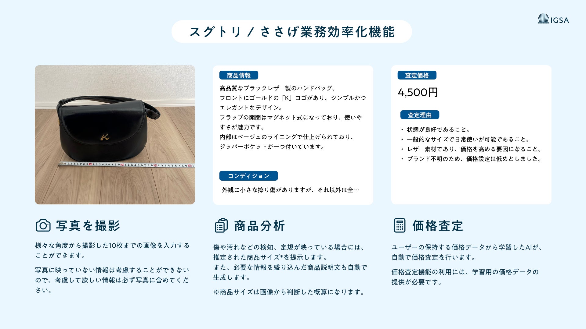 東京大学松尾研発のAIスタートアップである株式会社IGSA(東京都文京区本郷 / 代表取締役CEO 松島創一郎)は、ヒストリカルデータ無しでスグに構築できるスグれた生成AI推薦システムを搭載した取引支援SaaS「スグトリ(旧スグレコ)」に、中古市場(リユース市場)におけるささげ業務の効率化を支援する機能を追加したことをお知らせいたします。