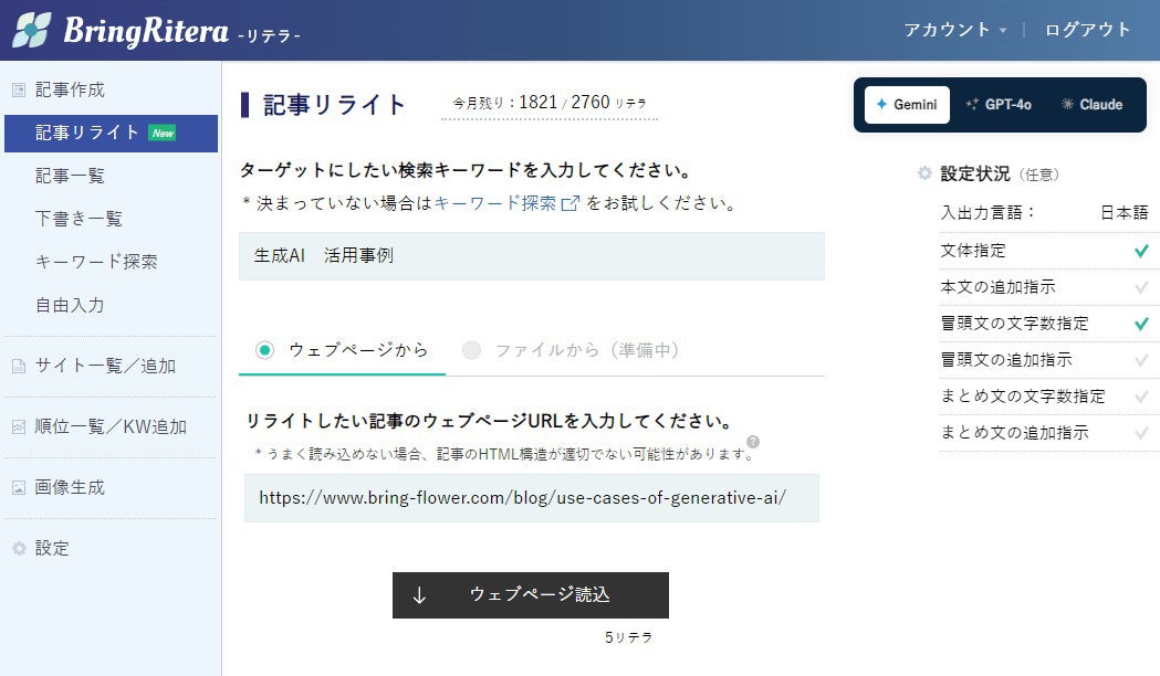ターゲットキーワードに加え、既存の記事のURLを入力するだけで、その内容についてBringRitera(リテラ)が学習のうえ活かしつつ、より最新でユーザーの検索意図に応えるSEOに強い記事にリライトします。