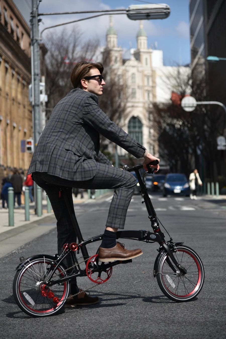 後輪部分をフレーム下部に収納。泥除け部分に車輪がついているので折りたたんだ状態で転がして持ち運ぶことができます。軽量折畳と電動の2タイプを乗り比べてください。