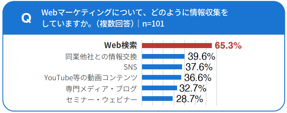 「Webマーケティングについて、どのように情報収集をしていますか?」と質問したところ、「Web検索(Google、Yahoo!など)」が65.3%で最多 となりました。