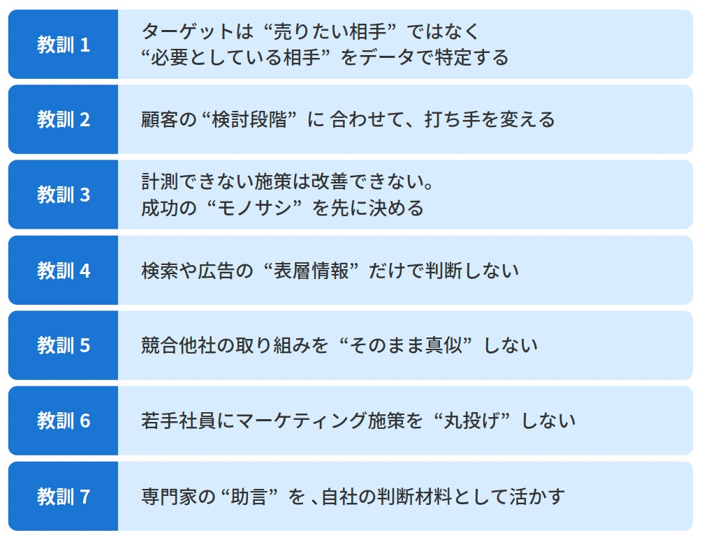 本調査で明らかになった失敗要因を裏返し、成功するための原則として体系化したものが、今回公開する「失敗から学ぶWebマーケティング7箇条」です。