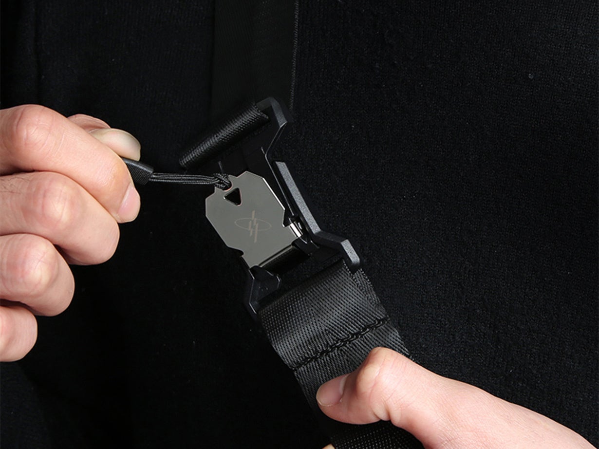 バックル部は脱着が簡単におこなえるマグネット式を採用しているので、バッグを持ち上げることなく、片手でスムーズにショルダーストラップのバックルの切り離しができます。