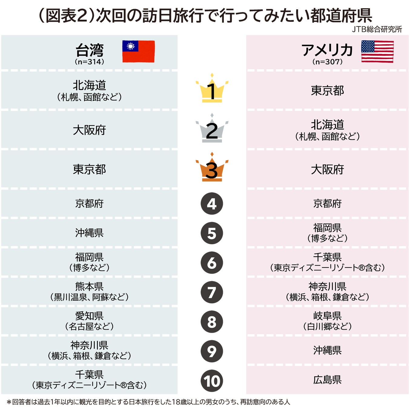 次回の訪日旅行で行ってみたい都道府県としては、東京、大阪、京都、北海道が共通して人気があり、台湾では沖縄、アメリカでは福岡も上位に挙がっています(図表2)。