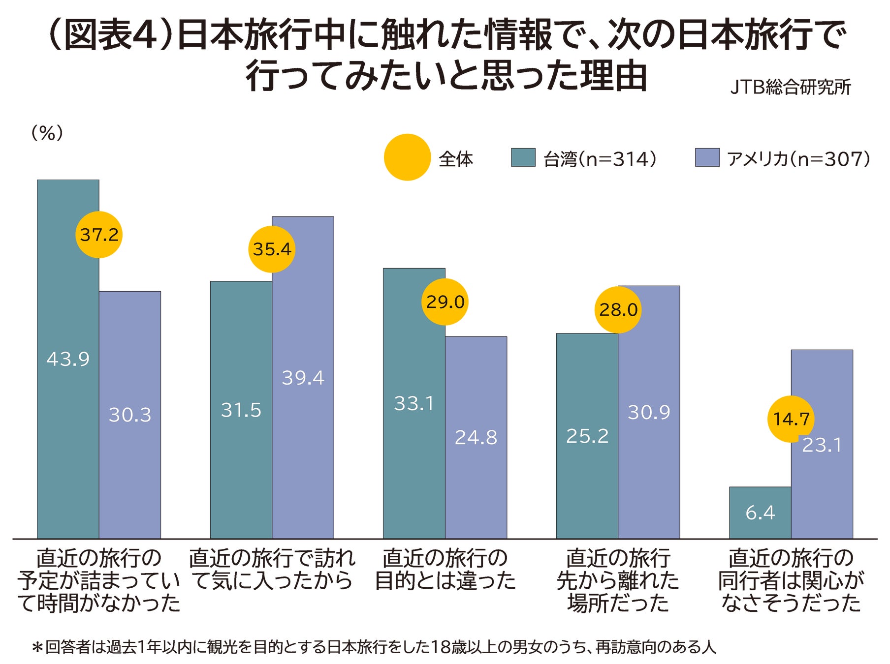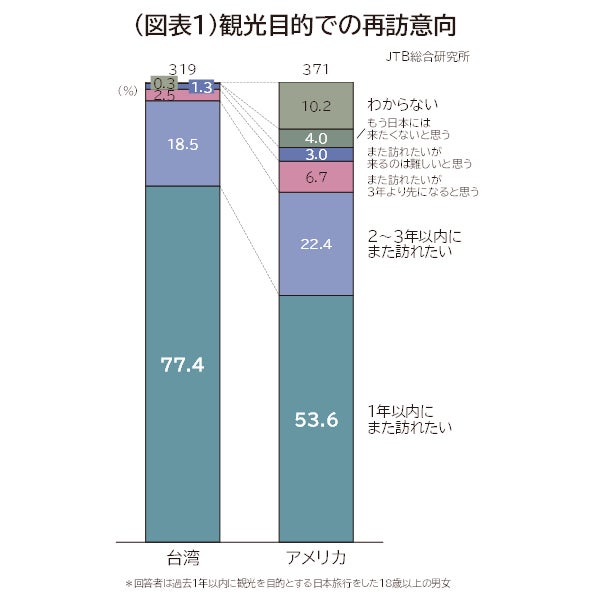 (1)台湾の旅行者の77.4%、アメリカの旅行者の53.6%は1年以内に再訪したい