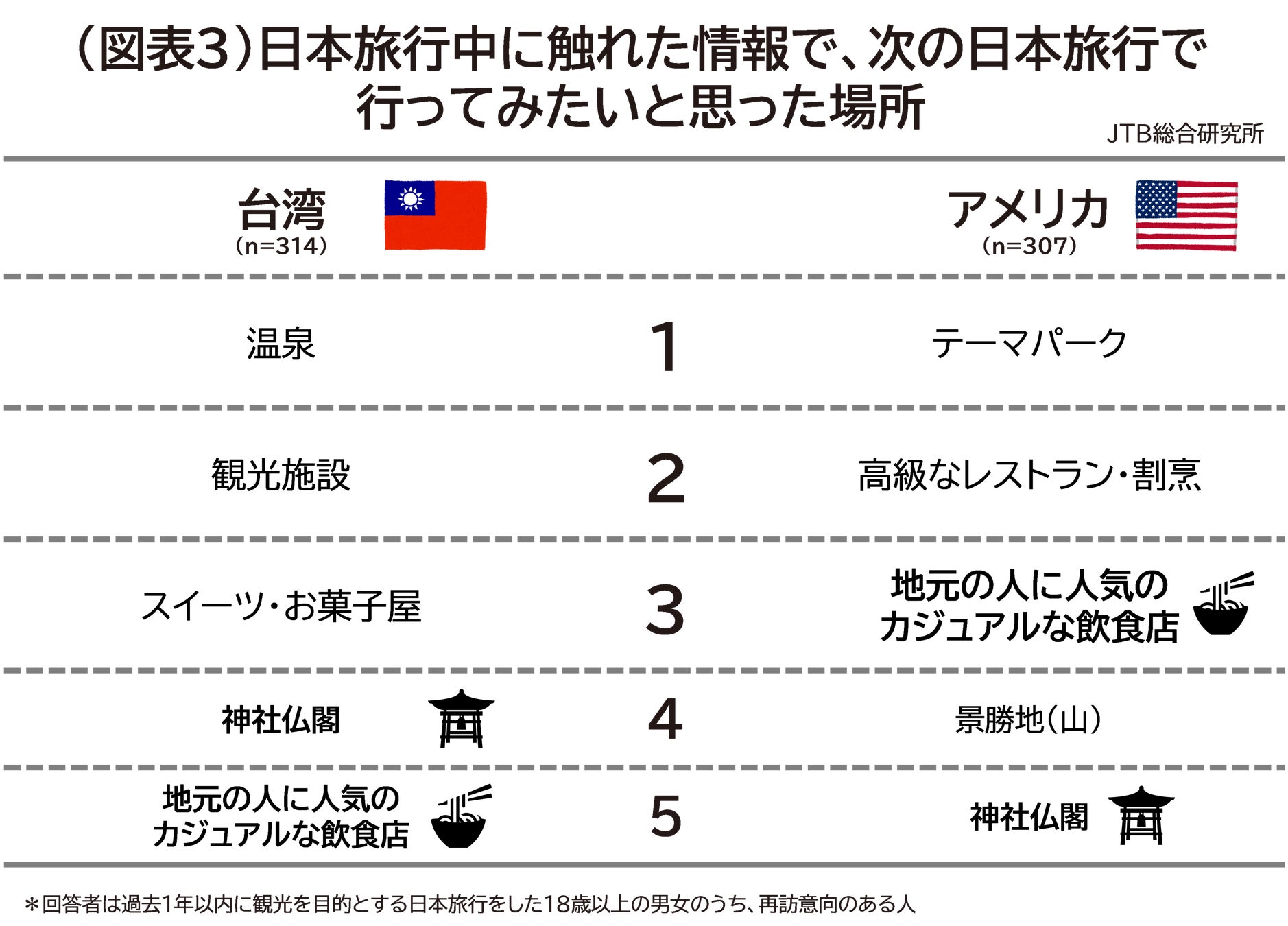 日本旅行中に触れた情報で、次回の日本旅行で行ってみたい場所として挙げられたのは、台湾では温泉、観光施設、スイーツ・お菓子屋さんがトップ3でした。一方、アメリカではテーマパーク、高級なレストラン・割烹、地元の人に人気のカジュアルな飲食店が上位で、地域ごとに特徴が分かれました。共通して高い人気を示したのは、「神社仏閣」と「地元の人に人気のカジュアルな飲食店」でした(図表3)。