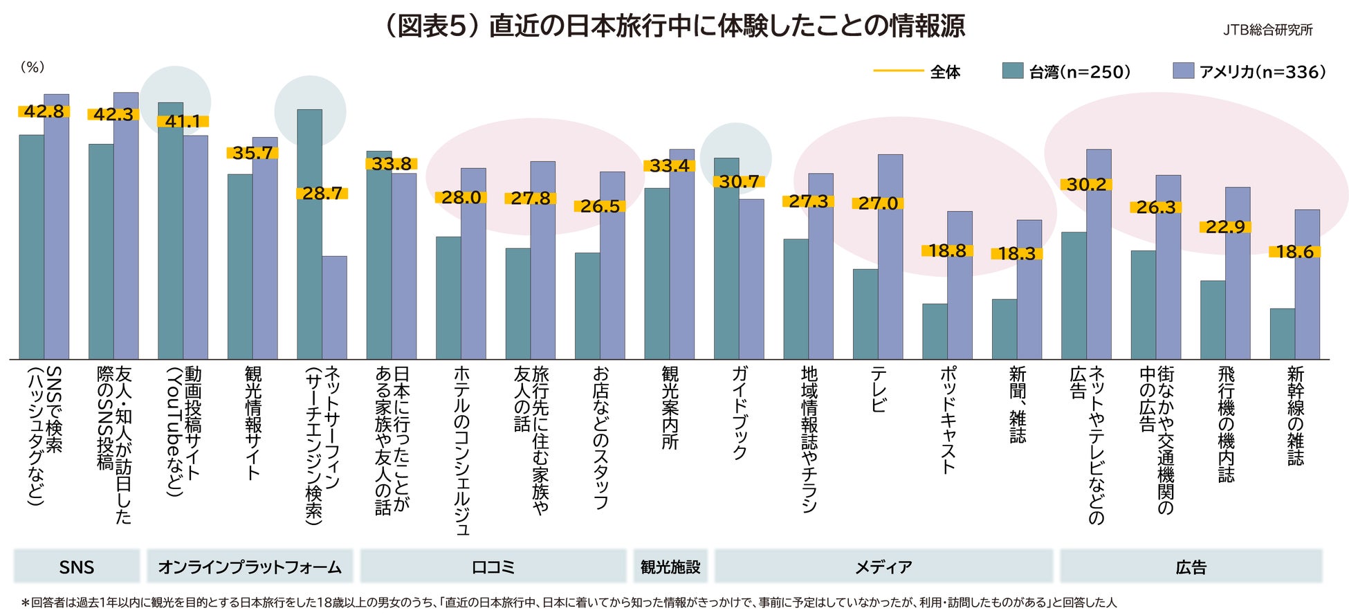 台湾からの旅行者は動画投稿サイト、ネットサーフィン、アメリカからの旅行者はSNSの利用が多い傾向