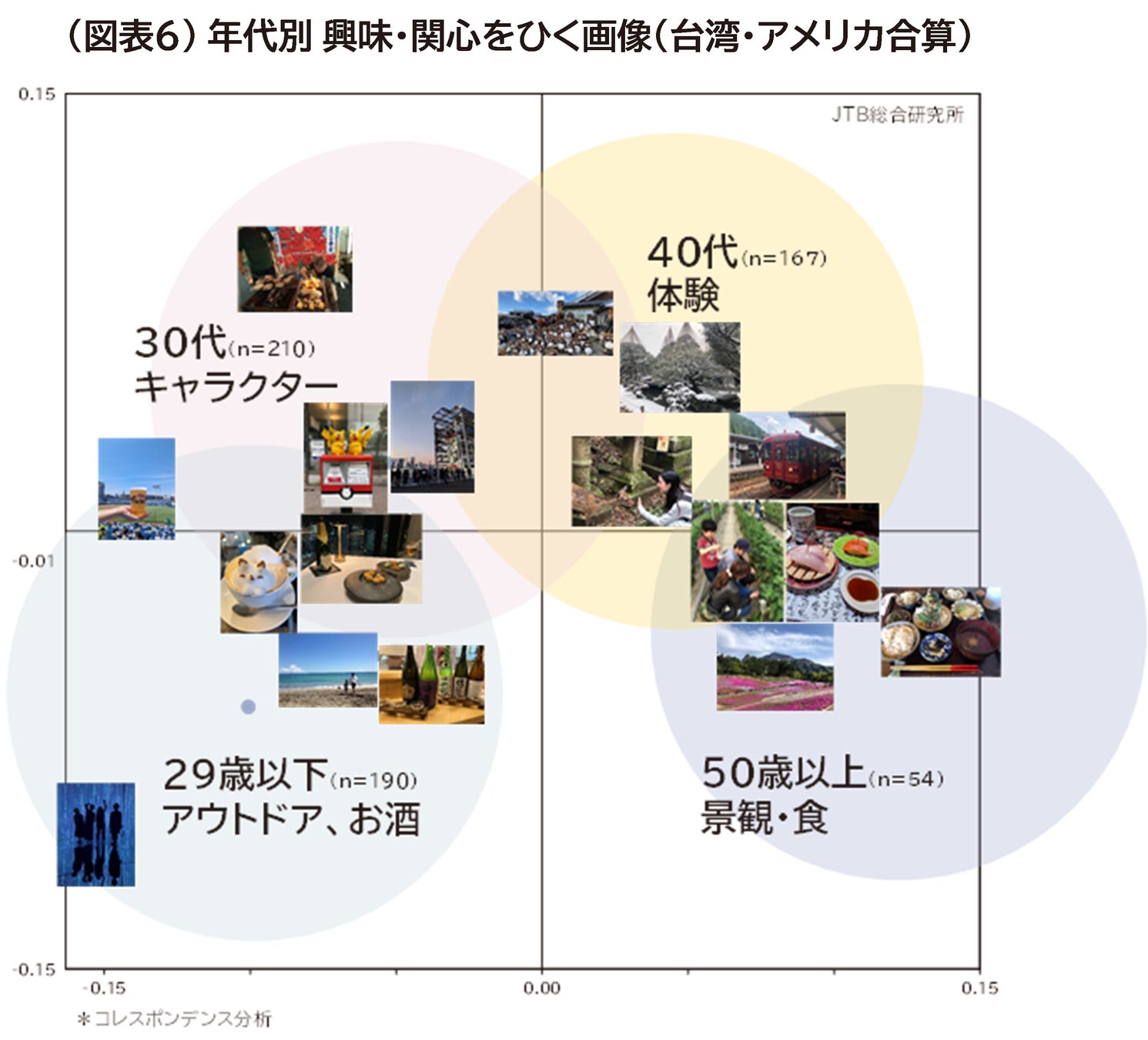 29歳以下は「アウトドア体験やお酒」、30代はキャラクター、40代は「体験」、50歳以上は「景観」や「食」