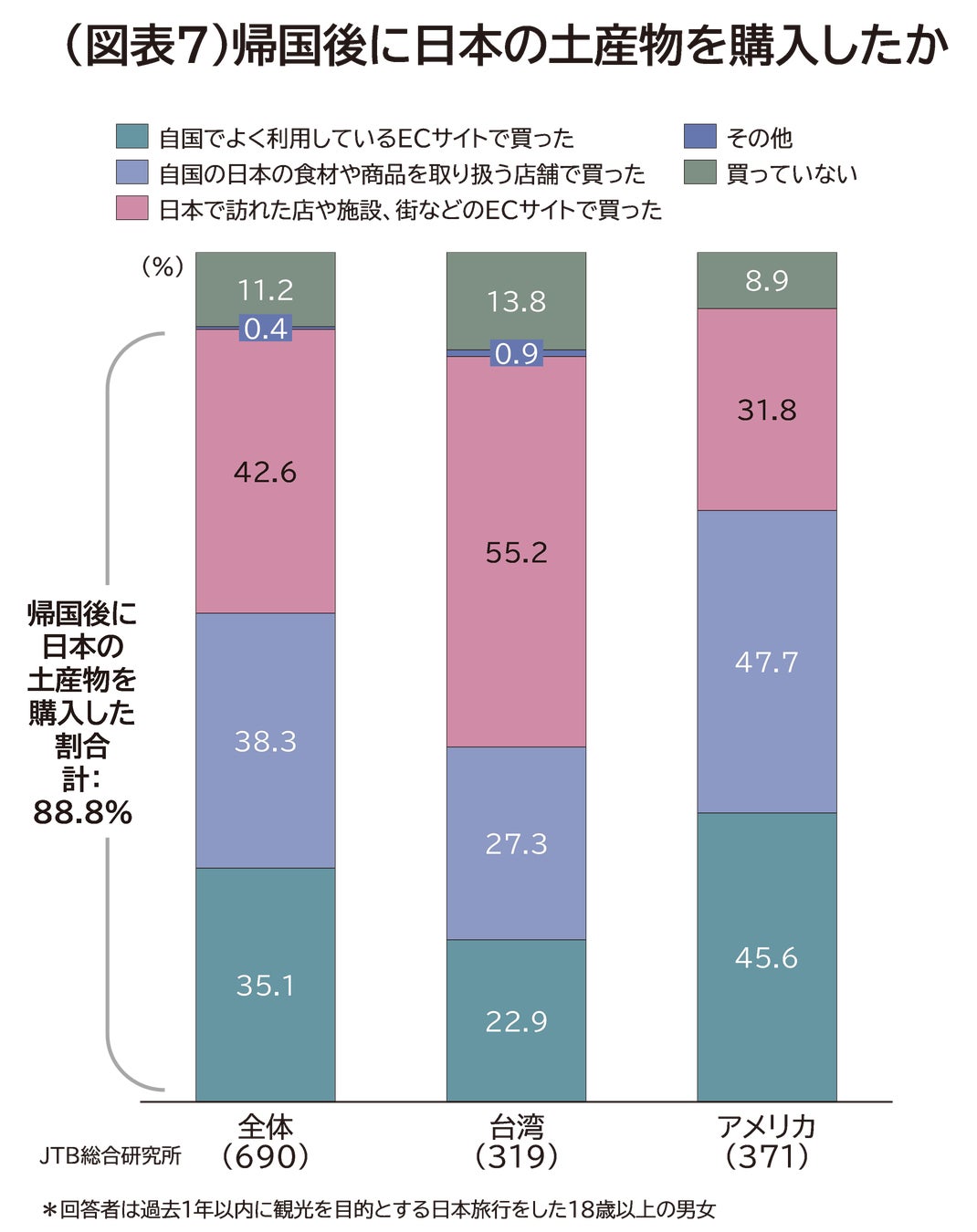 (5)全体の88.8%が帰国後にも日本の土産物を購入する。台湾の旅行者は、日本で訪れた店や街などのECサイト、アメリカの旅行者は、自国の店やECサイトを利用