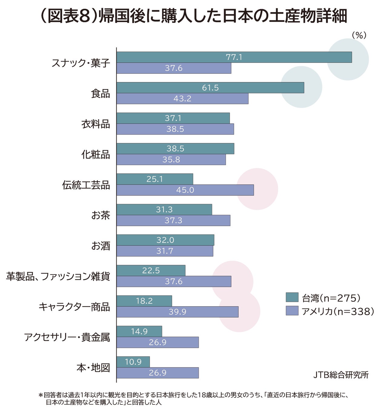 具体的に買っているものとしても、台湾とアメリカで違いがみられました。台湾の旅行者は「スナック菓子」や「食品」が上位となった一方、アメリカの旅行者は、「伝統工芸品」や「キャラクター商品」、「革製品・ファッション雑貨」など、食以外のものも購入する割合が高い結果となりました(図表8)。