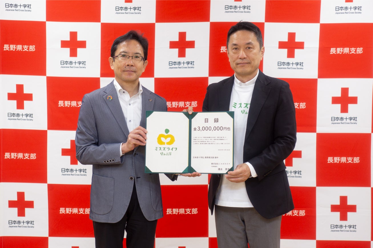 カットぶなしめじのパイオニアである株式会社ミスズライフ(本社:長野県上水内郡飯綱町、代表取締役:清水周英、「以下、当社」)は、被災地の復興にお役立ていただくための義援金として、2024年10月28日(月)に日本赤十字社 長野県支部に300万円を寄託いたしました。