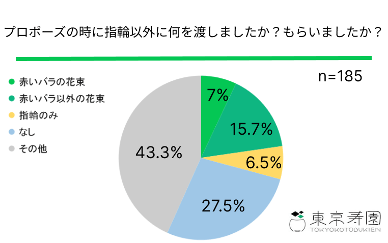 「プロポーズの時に指輪以外に何を渡しましたか?もらいましたか?」という質問に、「赤いバラの花束」と回答した方は7%、「バラ以外の花束」と回答した方は15.7%、「なし」と回答した方は21.5%、「指輪のみ」と回答した方は6.5%、「その他」と回答した方%という結果になりました。