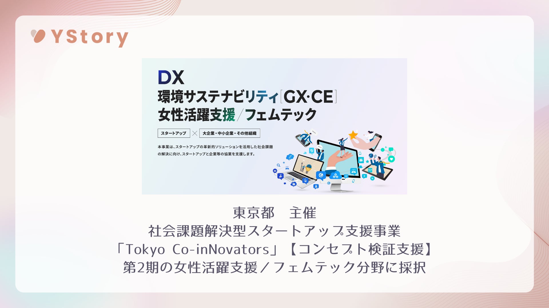 株式会社YStoryは東京都が2024年度より開始した社会課題解決型スタートアップ支援事業「Tokyo Co-inNovators」の【コンセプト検証支援】第2期の採択企業として選定されました。