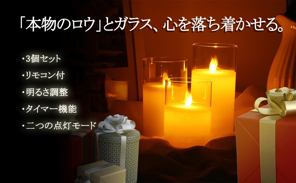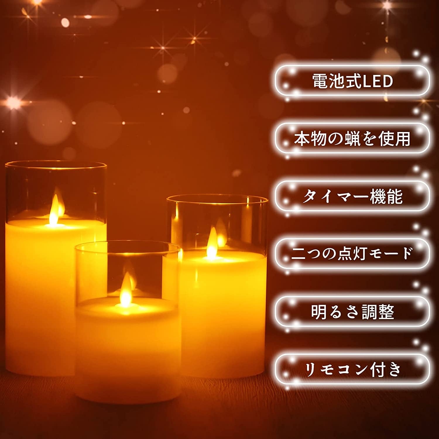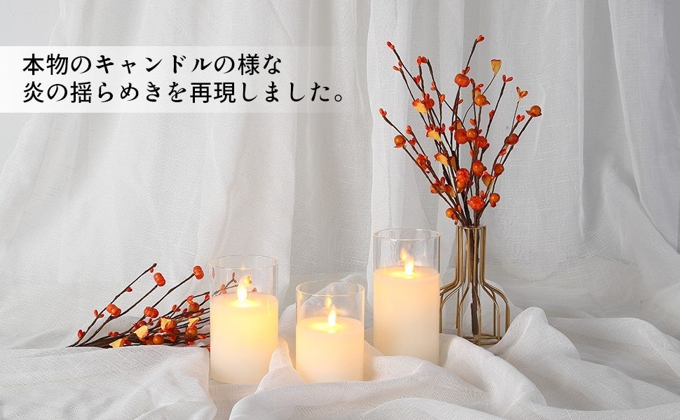 新しいLEDキャンドルライトセットが登場しました!このセットにはクリアガラスのLEDキャンドルライトが3点入っており、専用リモコンも付属しています。本物のキャンドルと遜色ない炎の揺らぎで幻想的な雰囲気を演出し、お部屋にロマンチックな癒しをもたらします。安心安全なLEDキャンドルは火を使わないので、子供やペットのいるご家庭でも安心して使用できます。さまざまなシーンで活躍し、クリスマスや誕生日パーティーなど特別なイベントにもぴったりです。さらに、専用リモコンで簡単に操作でき、タイマー機能や明るさの調節も可能です。高品質なLEDキャンドルライトセットで、おしゃれな空間を演出しましょう!