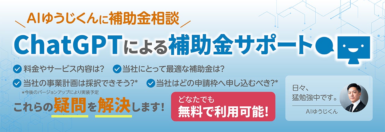 これまで支援機関から有料で提供されることも多かったこれらのサービスは、すべてのホームページ訪問者に無料で提供を予定しています。補助金でお悩みの際は是非ともChatGPTによる補助金サポートをご活用ください。