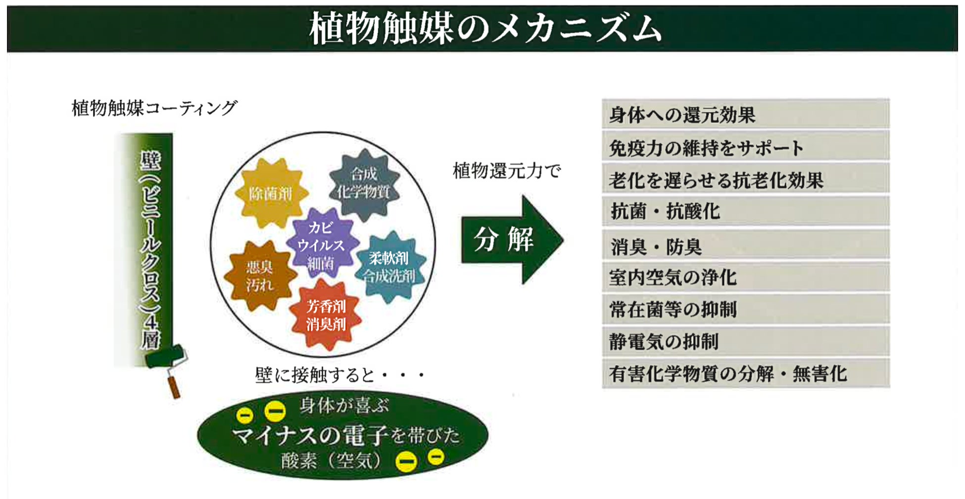 植物触媒機能配合の製品を天井壁、床等に塗布施工を行い室内の空気中に浮遊している化学物質、酸化物質を植物触媒の植物還元力で分解無害化し、分解無害化した空気にマイナスの電子が帯電するメカニズムです。