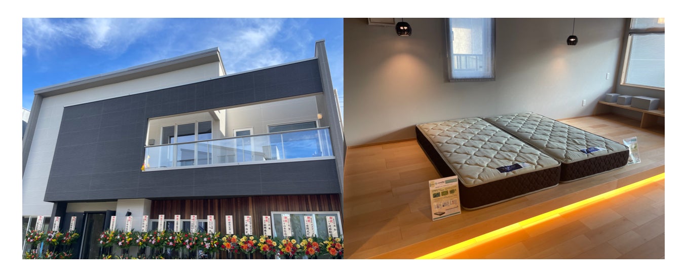 モデルハウス運営開始前にモデルハウス見学時に案内するお部屋1室に未施工部屋を作り、モデルハウス全体の空気感と未施工部屋の空気感の体感を出来るようにプランを組み、主寝室はしっかりと施工し、植物触媒機能が配合されたその他の暮らしの製品なども展示し、全国のモデルハウスでもまだ提供していないこれからの暮らしの提案「エイジングケア空間」の全国初のモデルハウスとして寝るだけでエイジングケア・還元作用が認められた株式会社東京ベッド製造のベッドマットレスの展示も行っております。