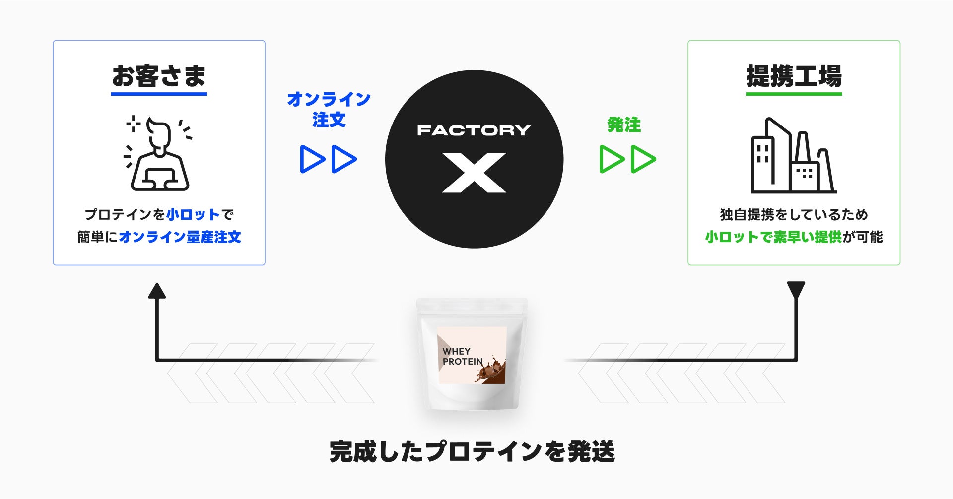 アンパサンドはこれらの課題を解決すべく、プロテインの製造販売に携わっているODD FUTUREと協業し、オンラインでオリジナルのプロテインを発注できるプラットフォーム「Factory X」を開発しました。7カ月のプレローンチ期間を経て、12月21日(木)よりグランドローンチします。